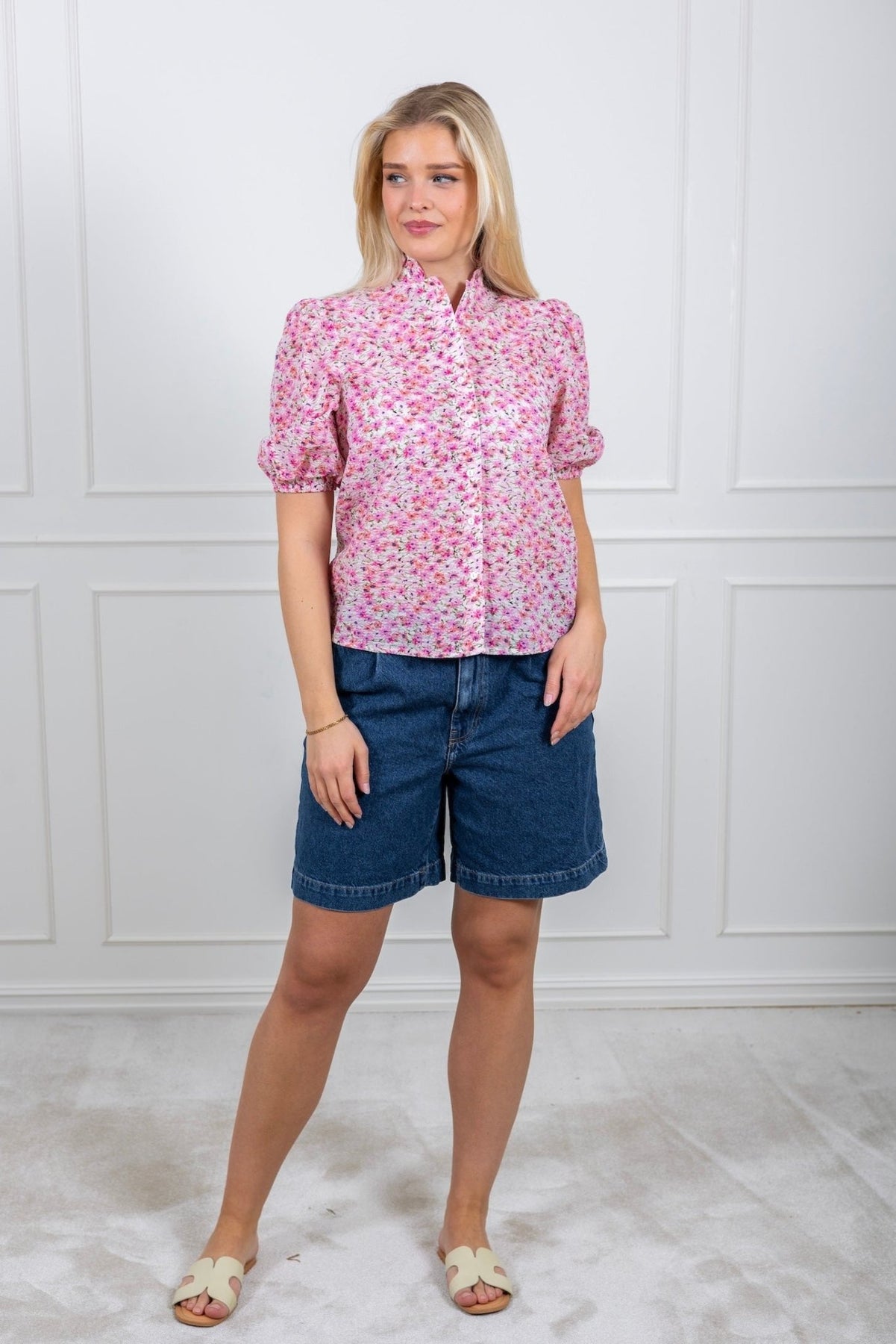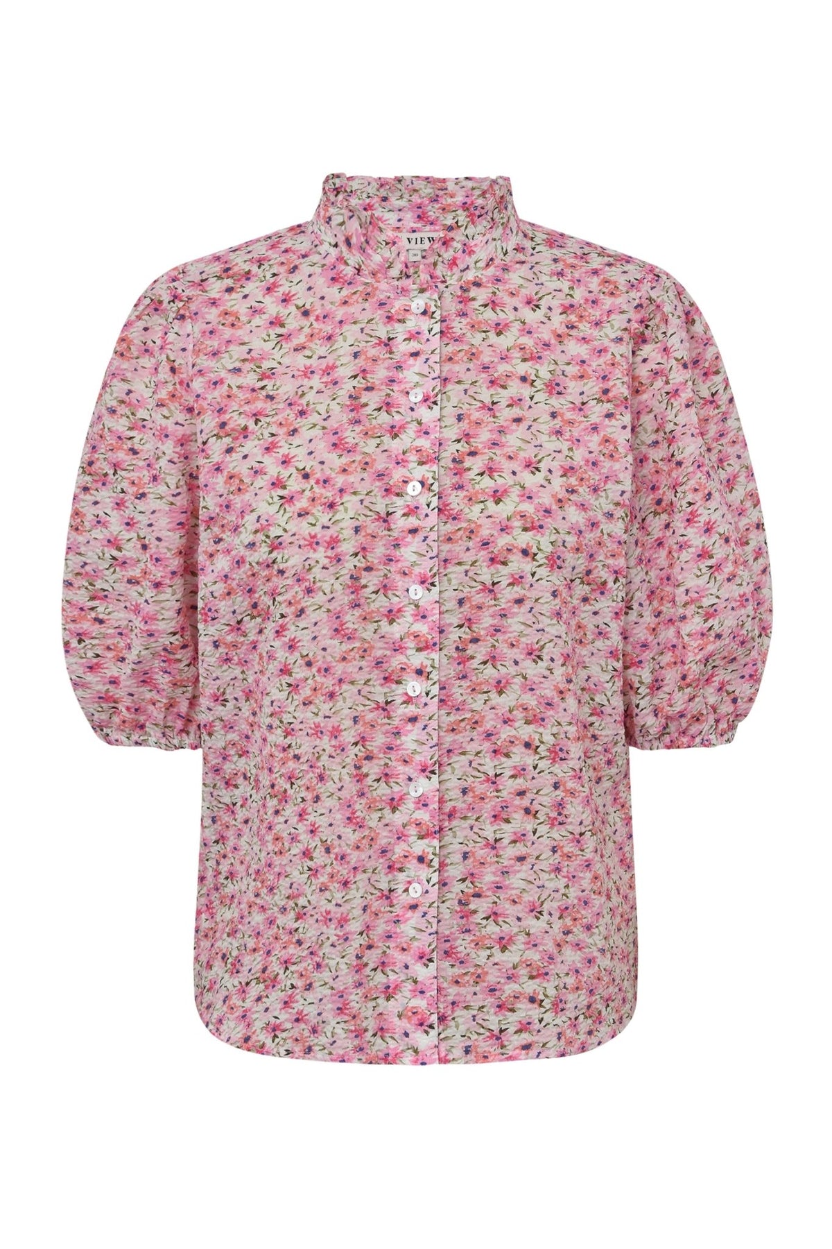 Tiffany Short Sleeve Shirt Rose/Pink fra A-VIEW er en kortermet skjorte som utmerker seg med sin løse passform og vakre blomstertrykk. Tiffany Short Sleeve Shirt har en høy rynket krage som gir et elegant preg. Denne skjorten har en mild ballongerme og lukkes foran med en knappelukking. Skjorten er normal i størrelse. Den er laget av 100% bomull, noe som sikrer komfort og holdbarhet. Ideell for både hverdags- og festbruk.