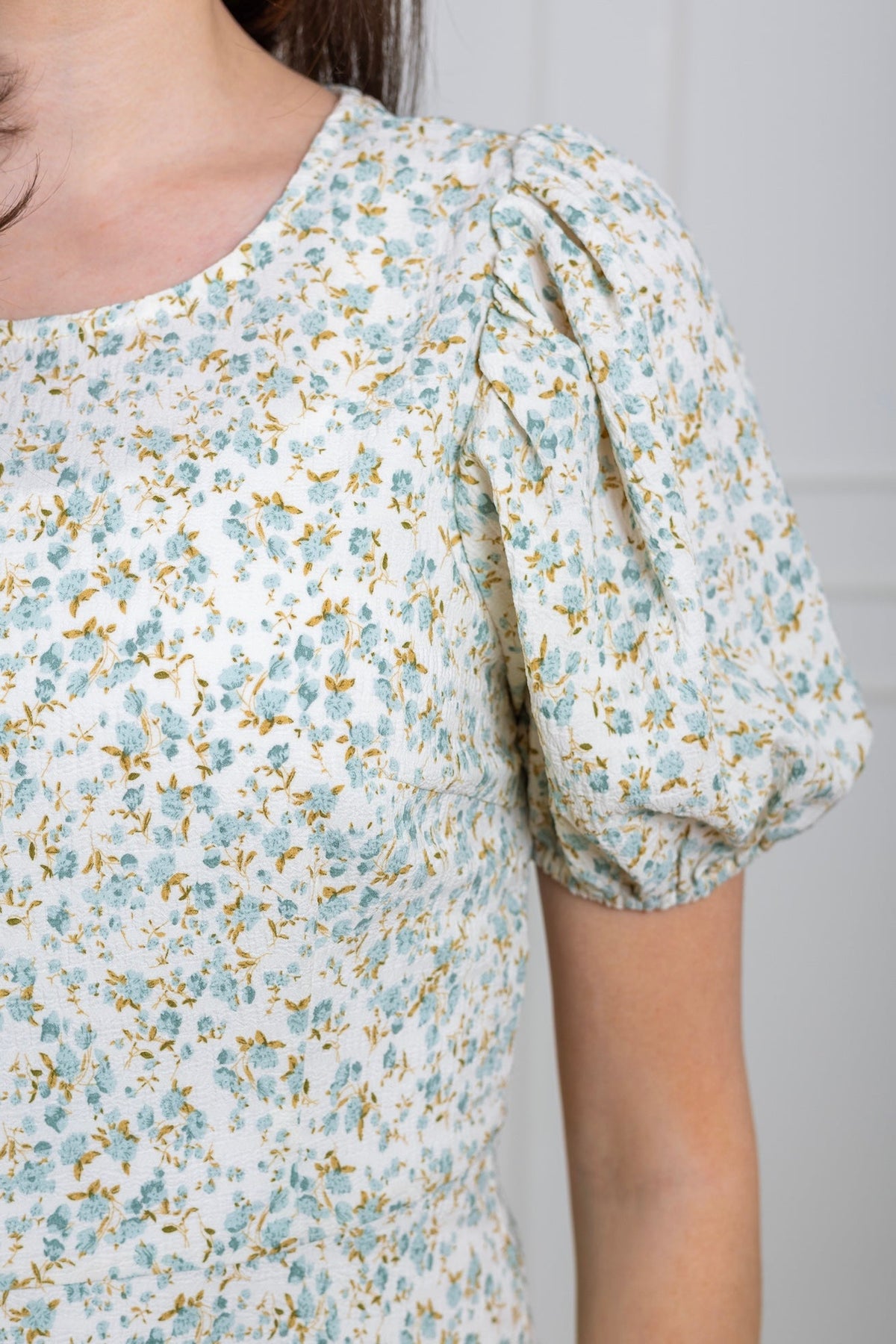 Gino Dress Pale Mint/Off White fra A-VIEW er en elegant og tiltalende kjole for enhver anledning. Denne midikjolen har et blomstermønster som gir den et friskt og feminint utseende. Gino Dress Pale Mint/Off White har korte ermer med en puffeffekt, elastikk i hem og en rund hals. Kjolen er tro mot størrelsen, noe som sikrer en flatterende passform. Den er laget av 100% polyester, noe som sikrer holdbarhet og komfort. Velg A-VIEW for en stil som skiller seg ut.