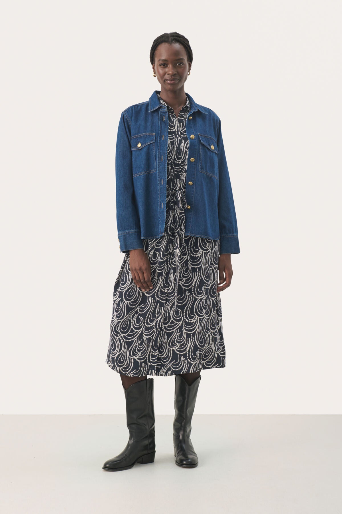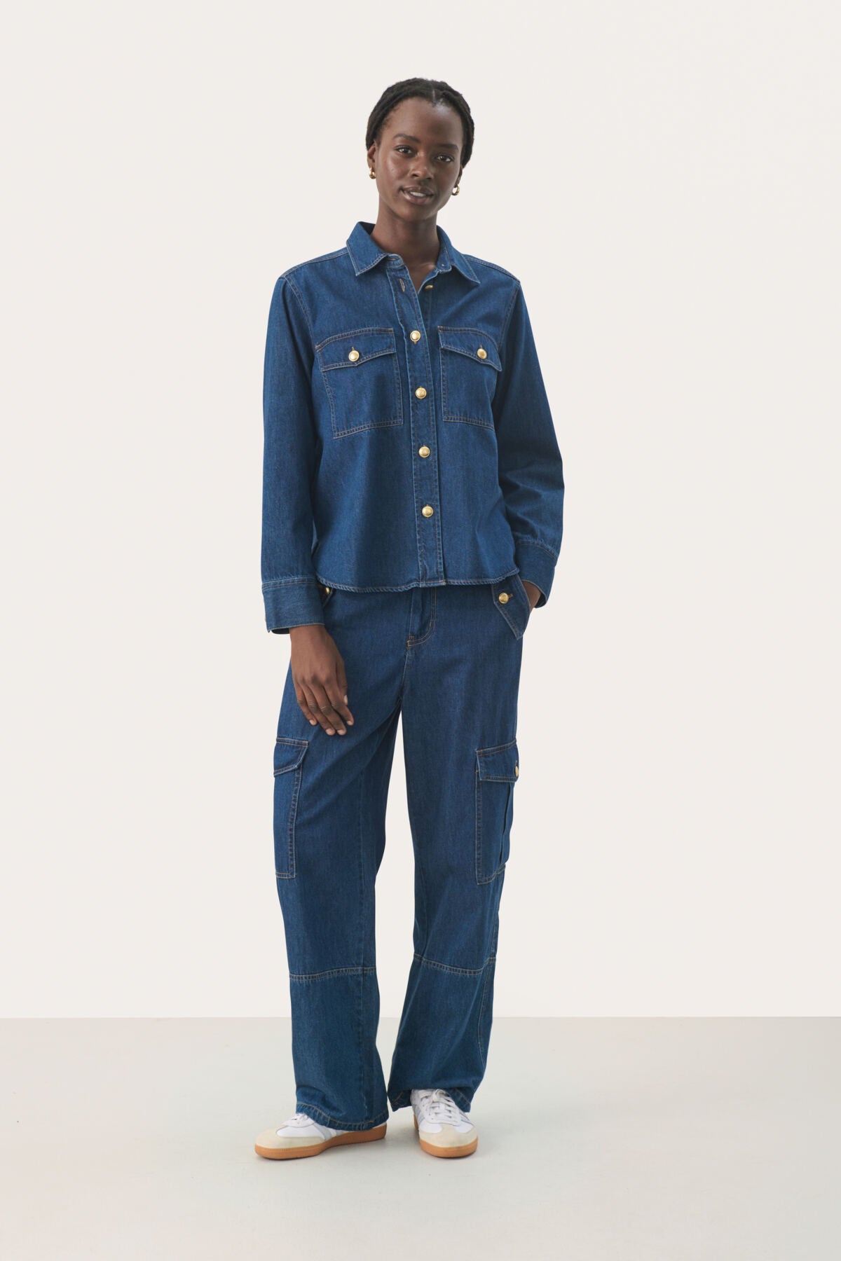 Payapw Shirt Dark Vintage Denim fra Part Two er en stilig skjorte i fargen dark vintage denim. Denne vevde skjorten med lange ermer er laget av en behagelig blanding av 83% bomull og 17% lyocell (tencelt). Den er ideell for både formelle og uformelle anledninger. Passer perfekt med jeans for en avslappet, men sofistikert look.
