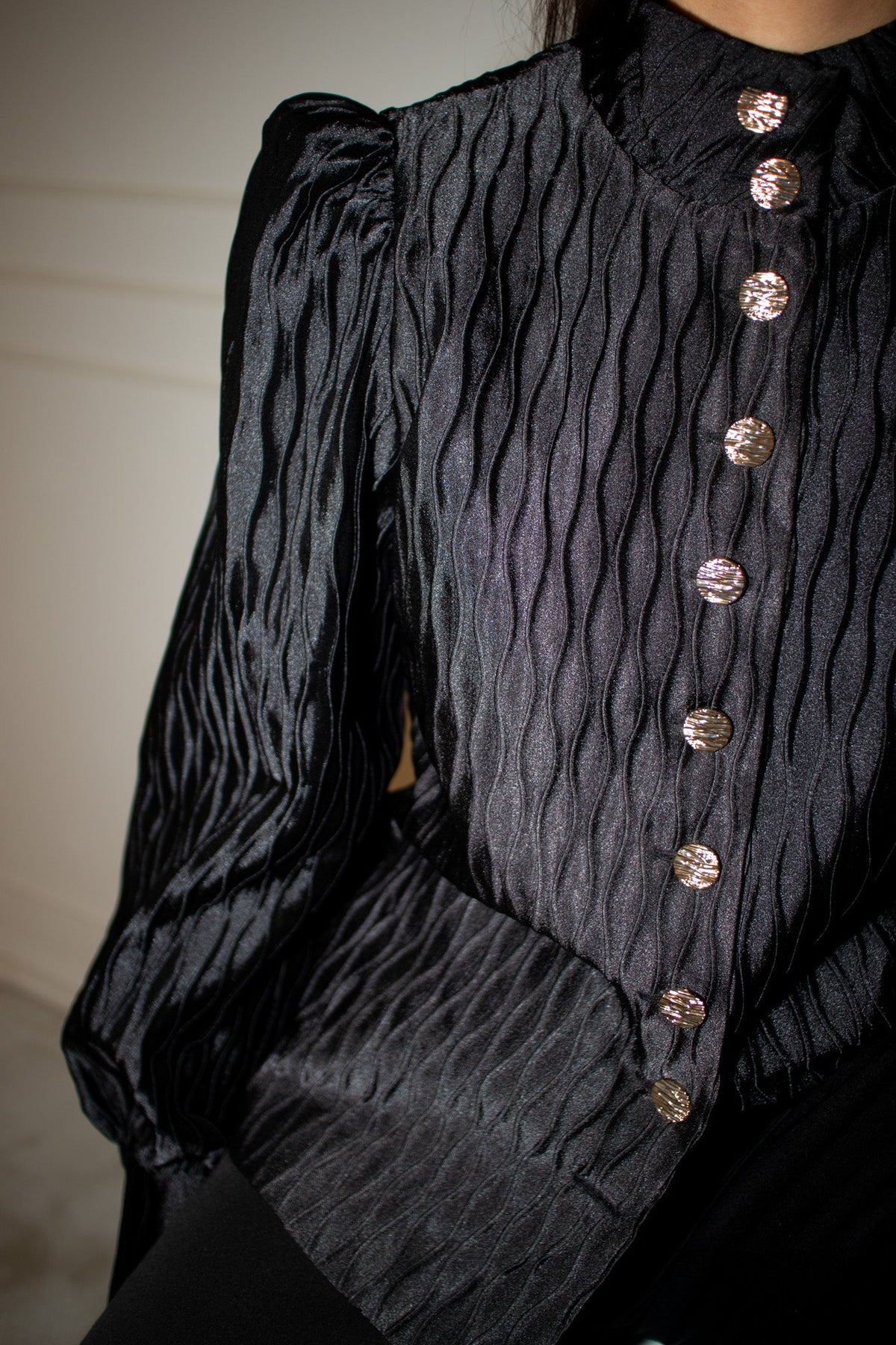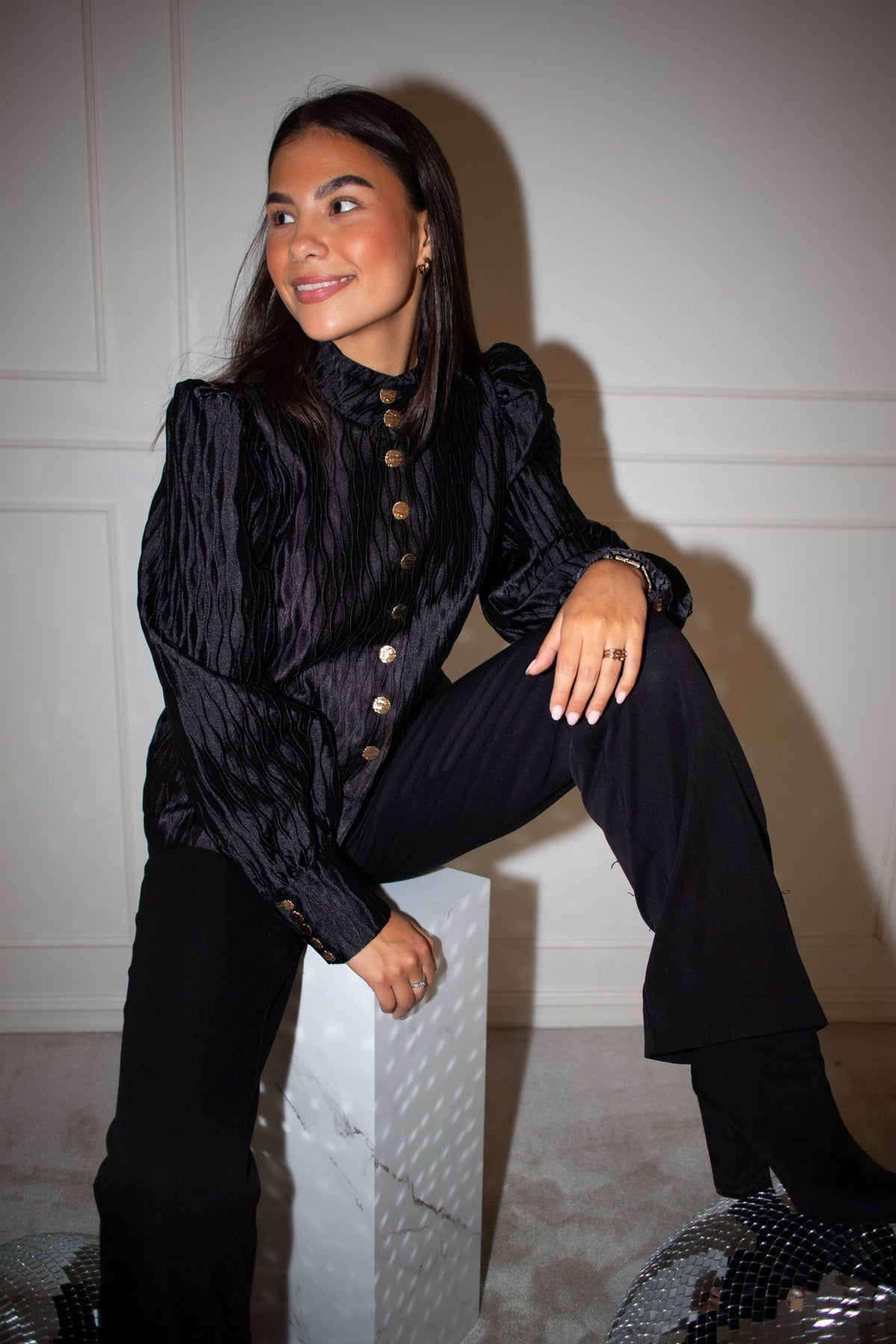 Ripple Ls Shirt Black fra YAS er en stilig skjorte som passer perfekt til festlige anledninger. Denne modellen er laget av et polyester satengstoff, et tungt og oppgradert stoff med en silkeaktig overflate og et vakkert fall. Ripple Ls Shirt Black har en skjortekrage, lange ermer med puffermer, høye mansjetter og knappelukking. Ekstra detaljer inkluderer knappe detaljer. Den har en normal passform som gir en komfortabel følelse. Kategorien er skjorter og bluser.