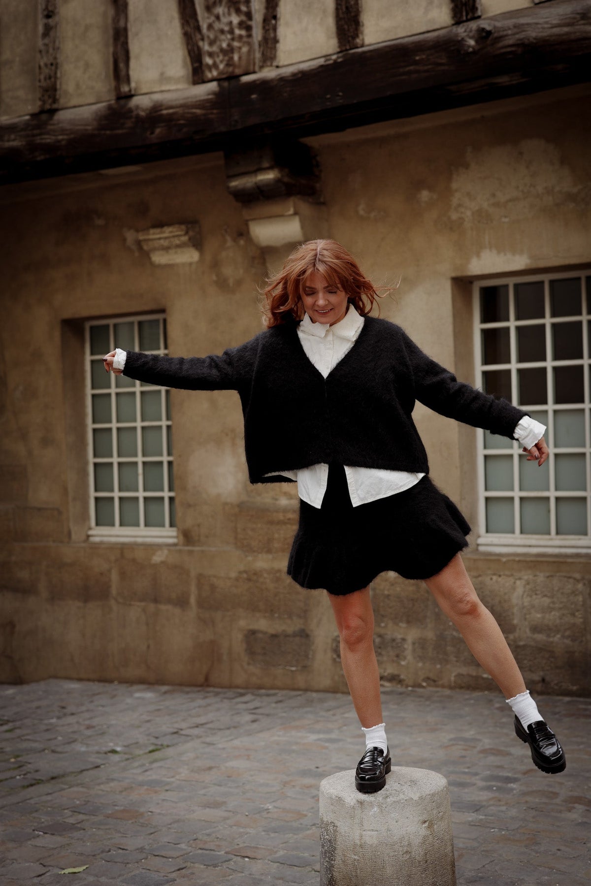 Knit Frill Skirt Black fra Confettibird er lekent og behagelig, og kombinerer komfort med sjarm. Knit Frill Skirt er laget i myk strikkekvalitet med en flatterende, elastisk midje, en moderne lengde og et feminint preg med den delikate volang-kanten. Bruk det sammen med chunky strikk for en helhetlig look, eller style det med boots for et moderne og uanstrengt antrekk.