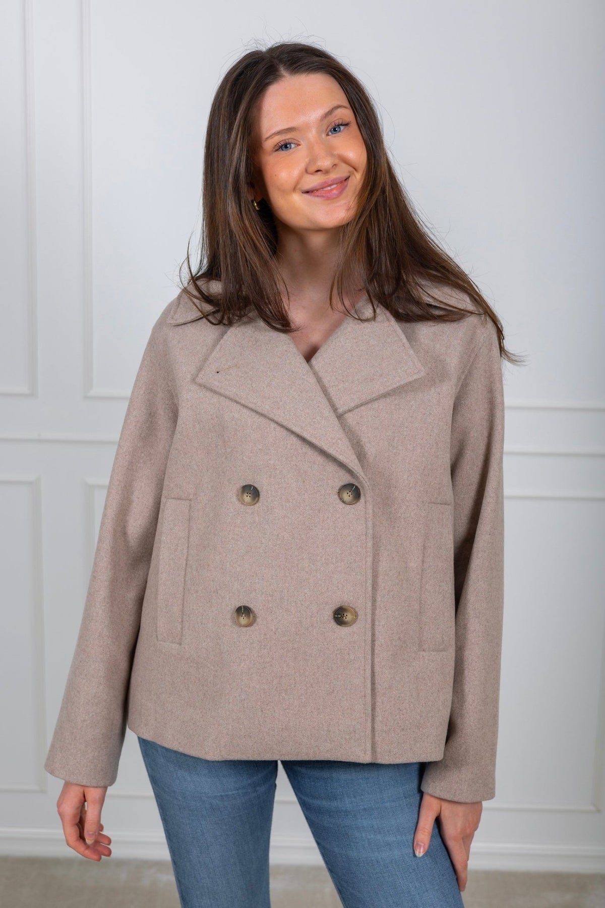 Alma kort ulljakke i sandshell melange fra Selected Femme er et must-have for høsten. Denne jakken gir komfort og varme, med lang ermer, reverskrage og knappelukking. Den har side lommer og er laget i kort lengde. Med fôr av resirkulert polyester, gir den en behagelig følelse. Jakken er vevet i enkel vev og består av 60% resirkulert ull, 35% polyester og 5% andre fibre. Perfekt for kvinner som verdsetter stil og bærekraft.