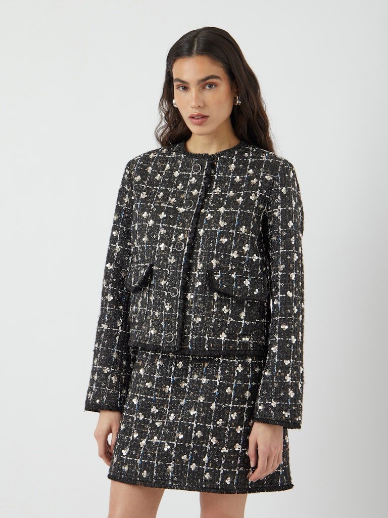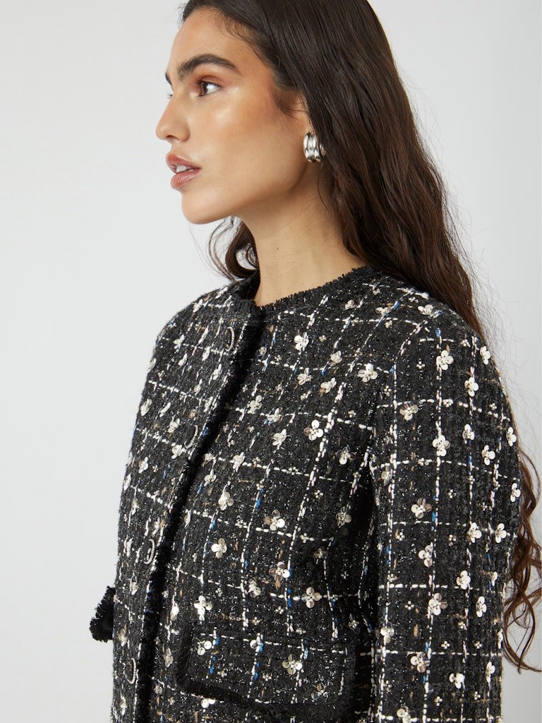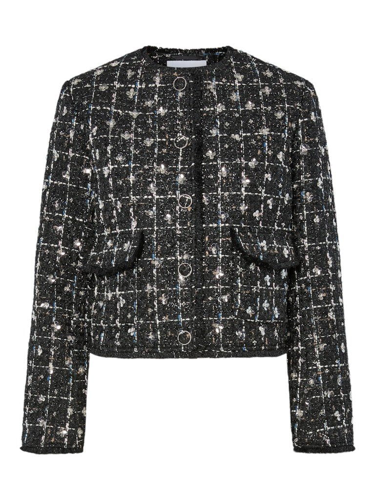 Valenda Ls Tweed Jacket Black fra YAS er en unik blazer som gir et moderne twist til skreddersøm. Denne modellen er laget i bouclé-stoff, et elegant og klassisk materiale kjent for sin nubbete tekstur og komfort. Med en knapp-ned krage og knappelukking, er Valenda Ls Tweed Jacket Black både allsidig og stilfull. Ekstra detaljer som sequins og en regulær passform gjør denne blazeren til et must i enhver garderobe.