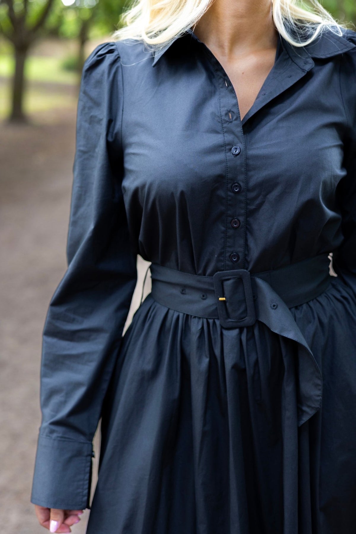 Poplin Shirt Dress Black fra byTiMo er en sofistikert kjole i sort farge. Denne kjolen er laget av 100% GOTS-sertifisert bomull og har en strukturert kvalitet. Poplin Shirt Dress Black har en maksimal lengde, lange ermer med løse firkantede mansjetter, en skjortekrage og knapper nedover toppen. Den har en avslappet midje og kommer med et matchende belte. Perfekt for enhver anledning, denne kjolen er et must i enhver garderobe. Type: Kjoler.