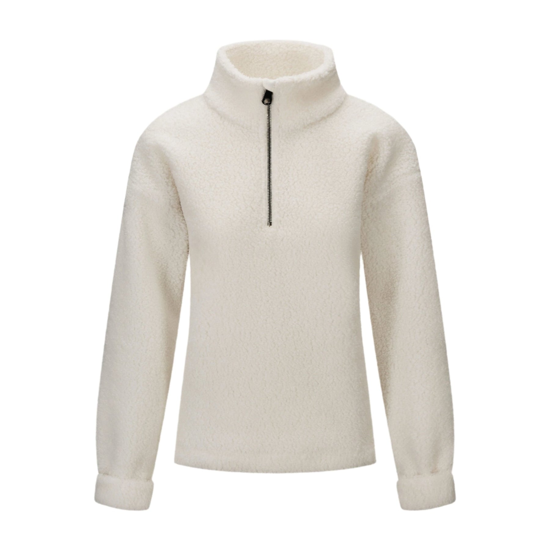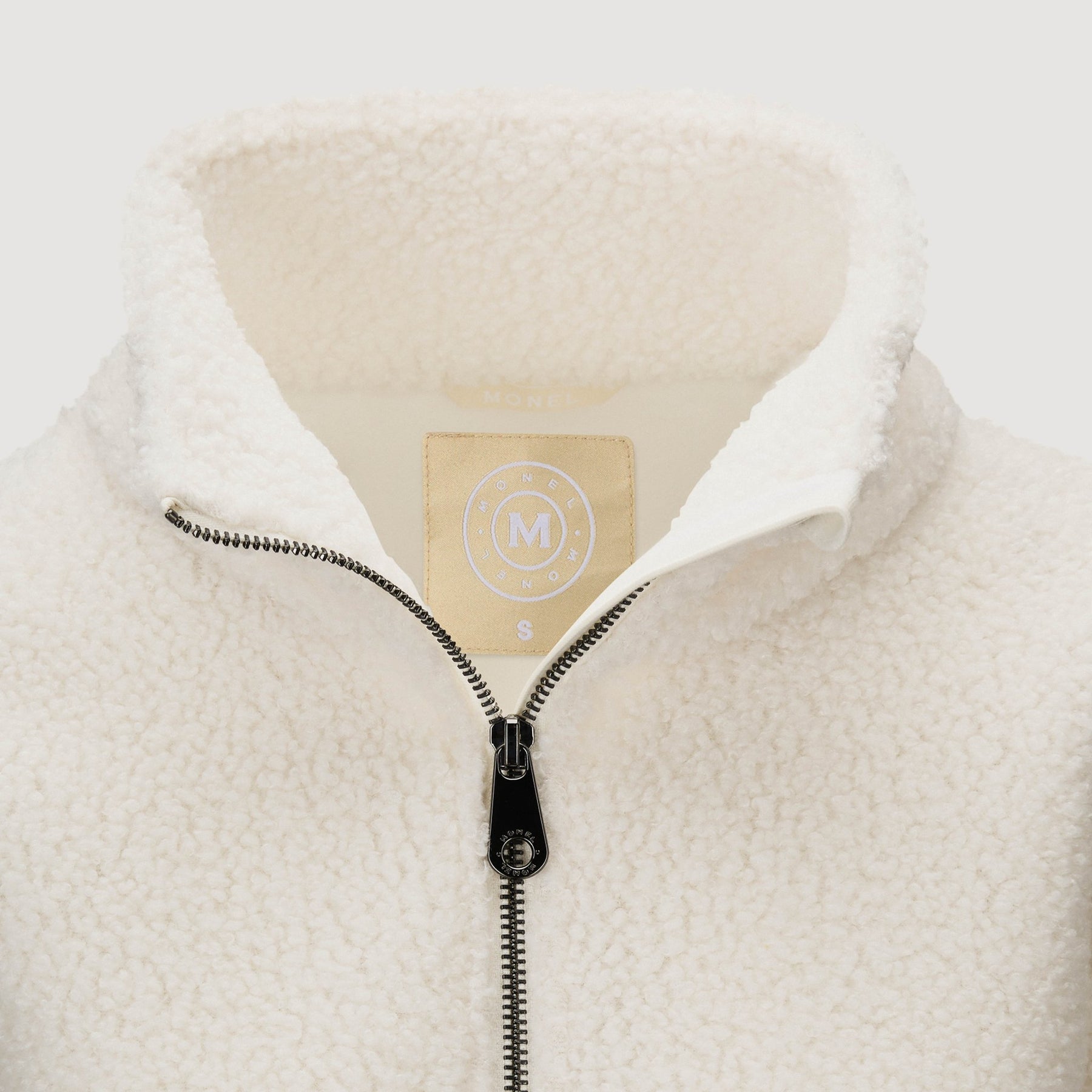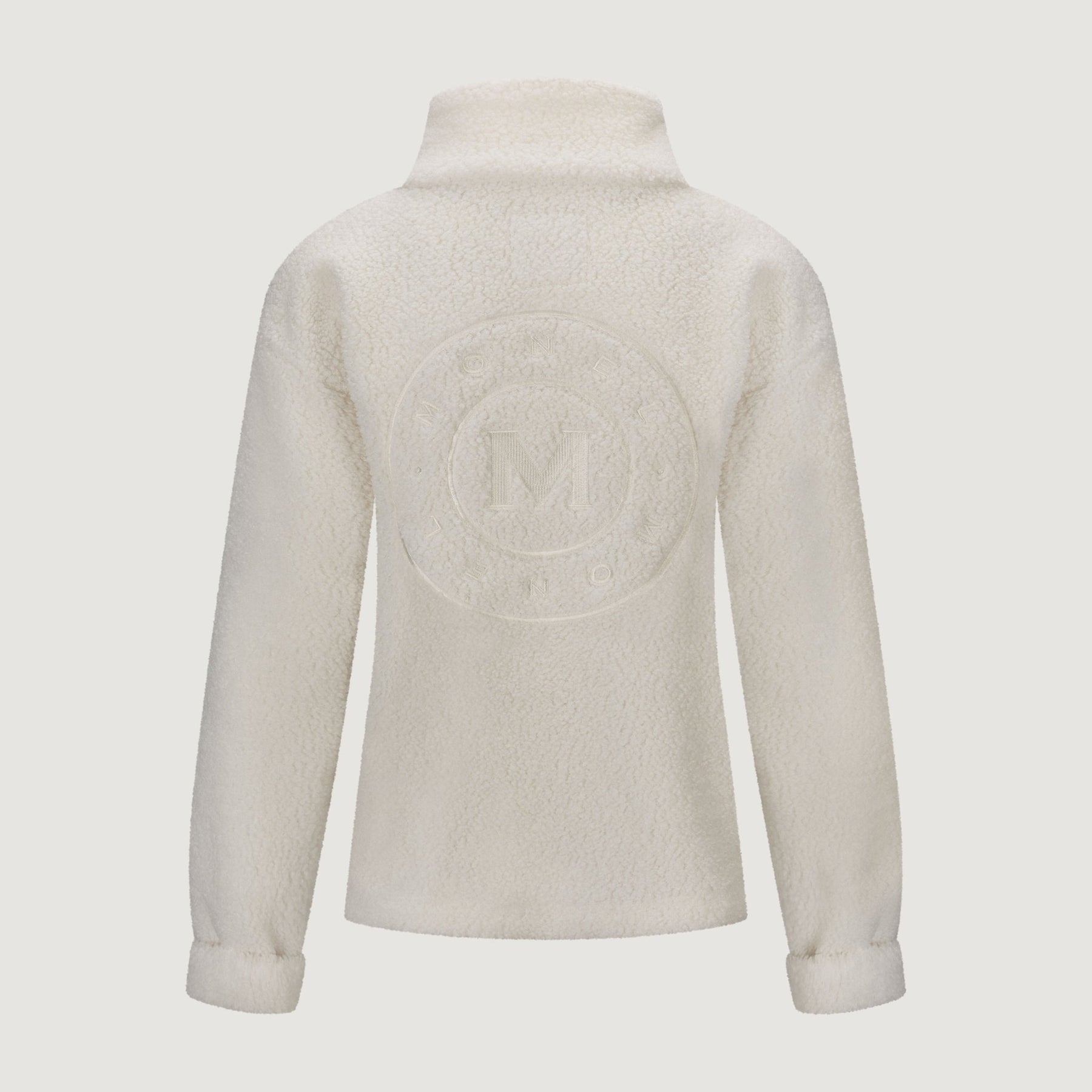 Annie Zip Sweater White fra Monel. Råkul hvit fleecegenser. Genseren har glidelås i kragen, oversized passform og en kul ton-i-ton logo brodert på ryggen. Passer perfekt til påskefjellet, skogsturer og kjølig sommerkvelder.