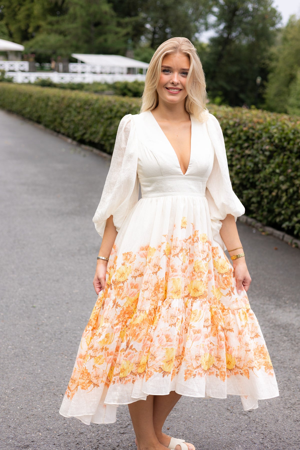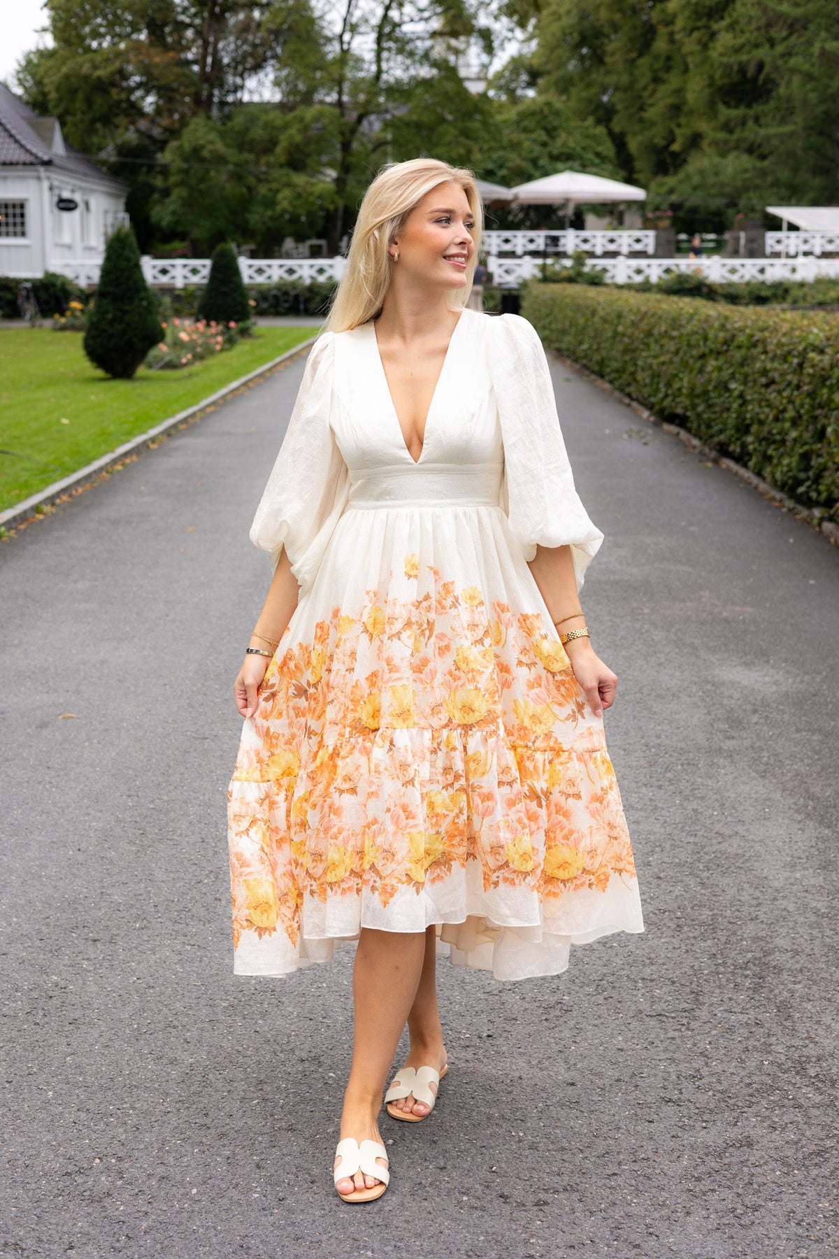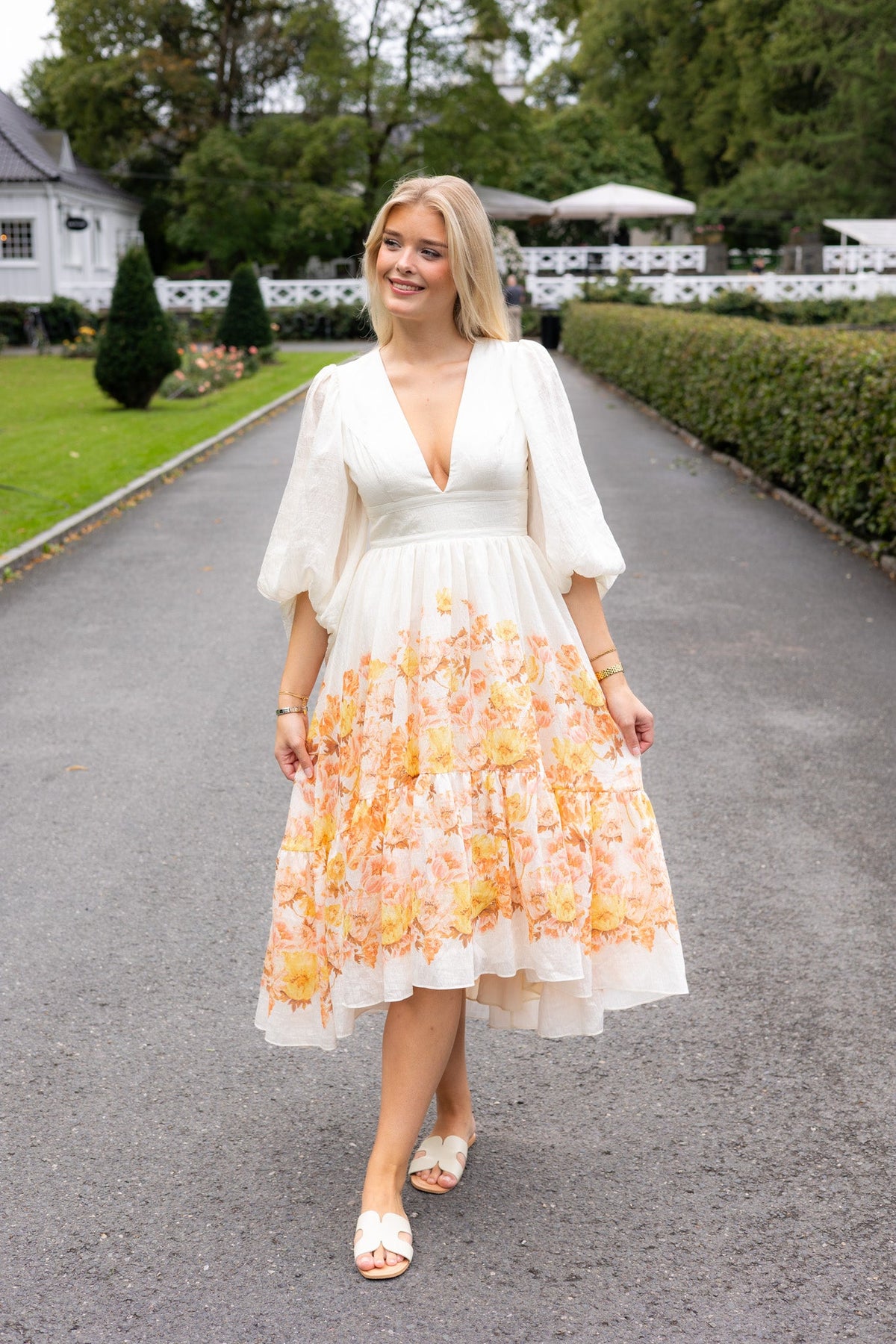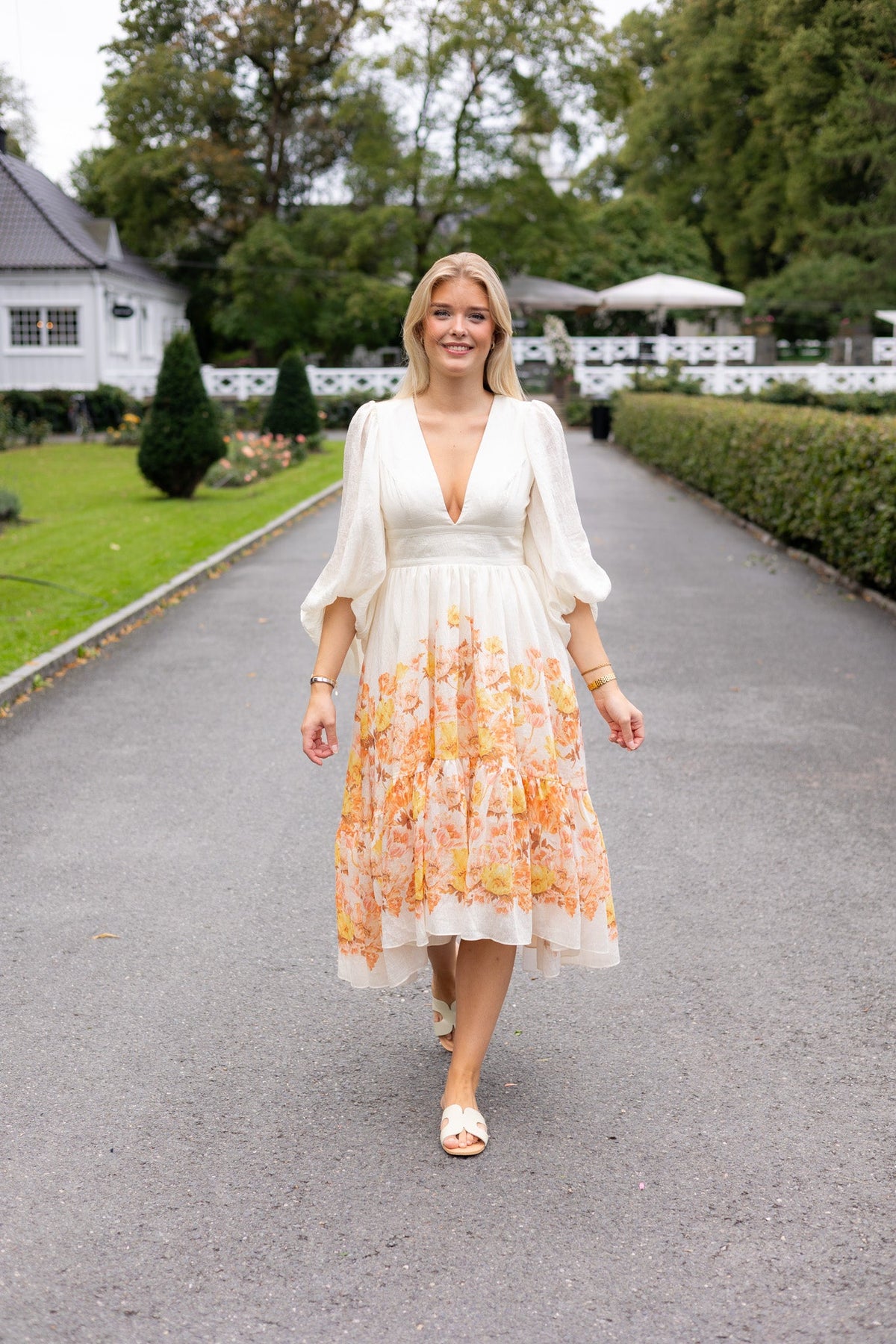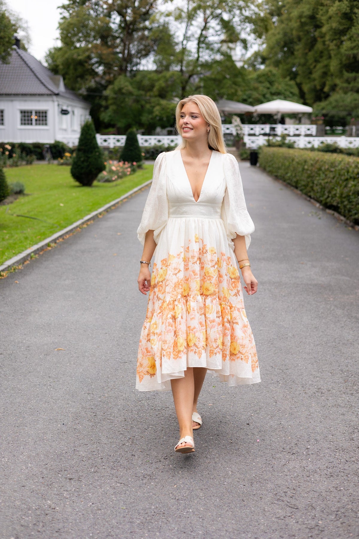 Sasia Deep V Neck Midi Dress i Cream Peony fra Malina er en trykt midi-kjole med en dyp V-hals, innsvinget midje og brede ermer. Den har en glidelås bak og er laget av 53% tencel, 32% bomull og 15% lin med en foring av 100% rayon. Sasia Deep V Neck Midi Dress kan vaskes på 30 grader. Kjolen er produsert i Guangdong-provinsen i Kina. Modellen er 178 cm høy og bruker størrelse S. Kjolen er tro mot størrelsen.