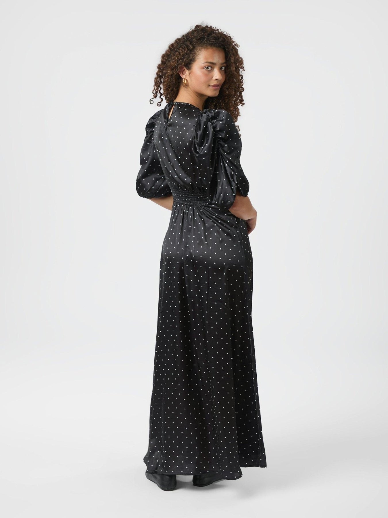 Kikka Dot Dress Black er en nydelig, feminin lang kjole fra Neo Noir. Med et vakkert roseprint, 3/4 ermer og smock detaljer ved midjen på baksiden, gir denne kjolen en sofistikert og elegant stil. Kikka Dot Dress Black har også en praktisk knappelukning i nakken. Modellen er 176 cm og bærer en størrelse 36. Denne kjolen er laget av 100% polyester, noe som gir en lett og behagelig følelse når du har den på.