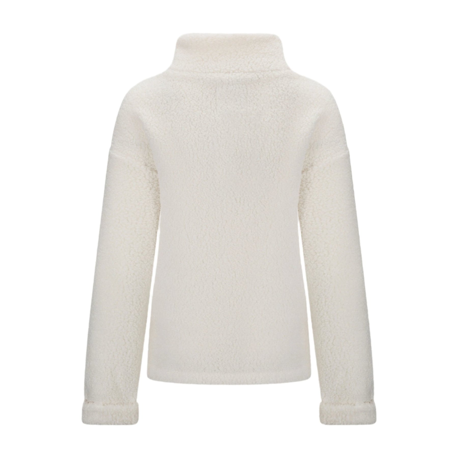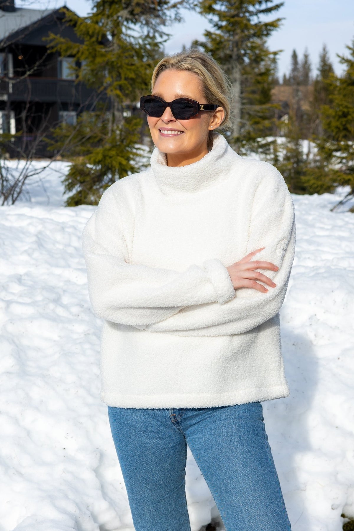 Karmen Sweater White fra Monel. Lekker hvit fleecegenser med høy hals og en avslappet passform. Liten ton-i-ton logo brodert på den ene armen. Perfekt til påskefjellet, båtturen og kjølig sommerkvelder.