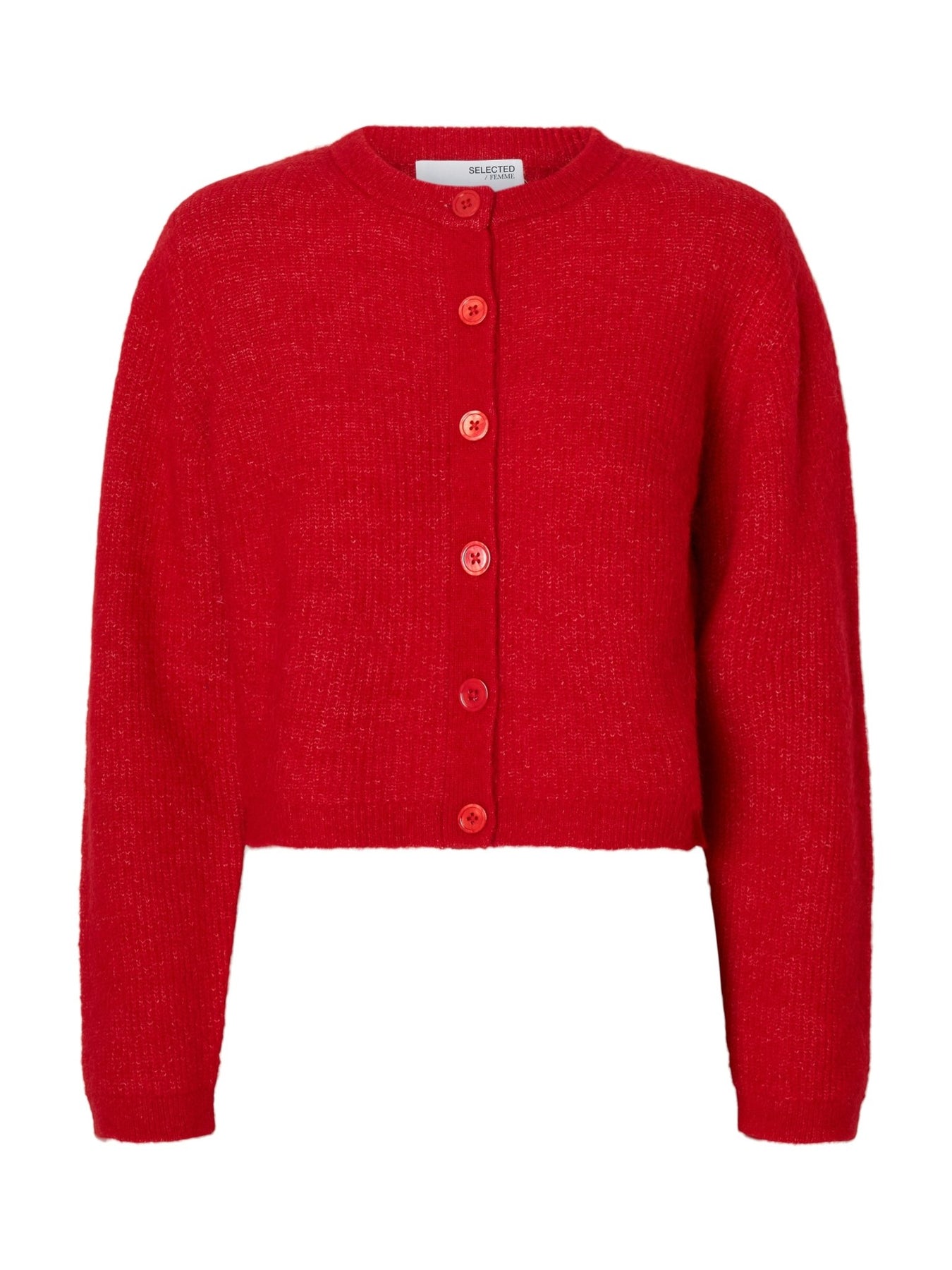 Sia Ras Ls Knit Cropped Cardigan Equestrian Red fra Selected Femme er et tidløst og komfortabelt valg for hverdagsgarderoben. Denne cardiganen har rund hals, lange ermer med droppede skuldre og ribbede mansjetter. Den lukkes med knapper og er cropped i lengden med en regular fit. Den er produsert i flatstrikk og består av 43% ull - RWS, 30% alpakka - Responsible Alpaca Standard, 23% nylon og 4% elastan. Sia Ras Ls Knit Cropped Cardigan Equestrian Red er en pullover-type genser.