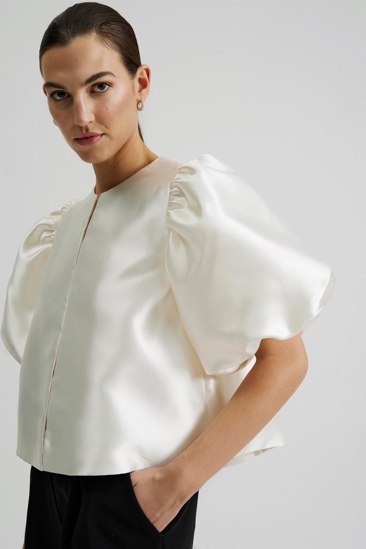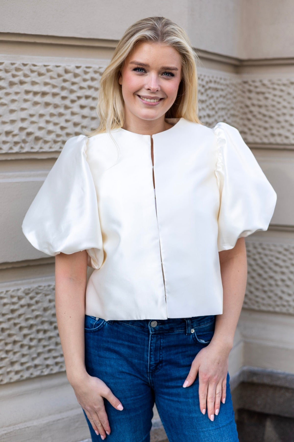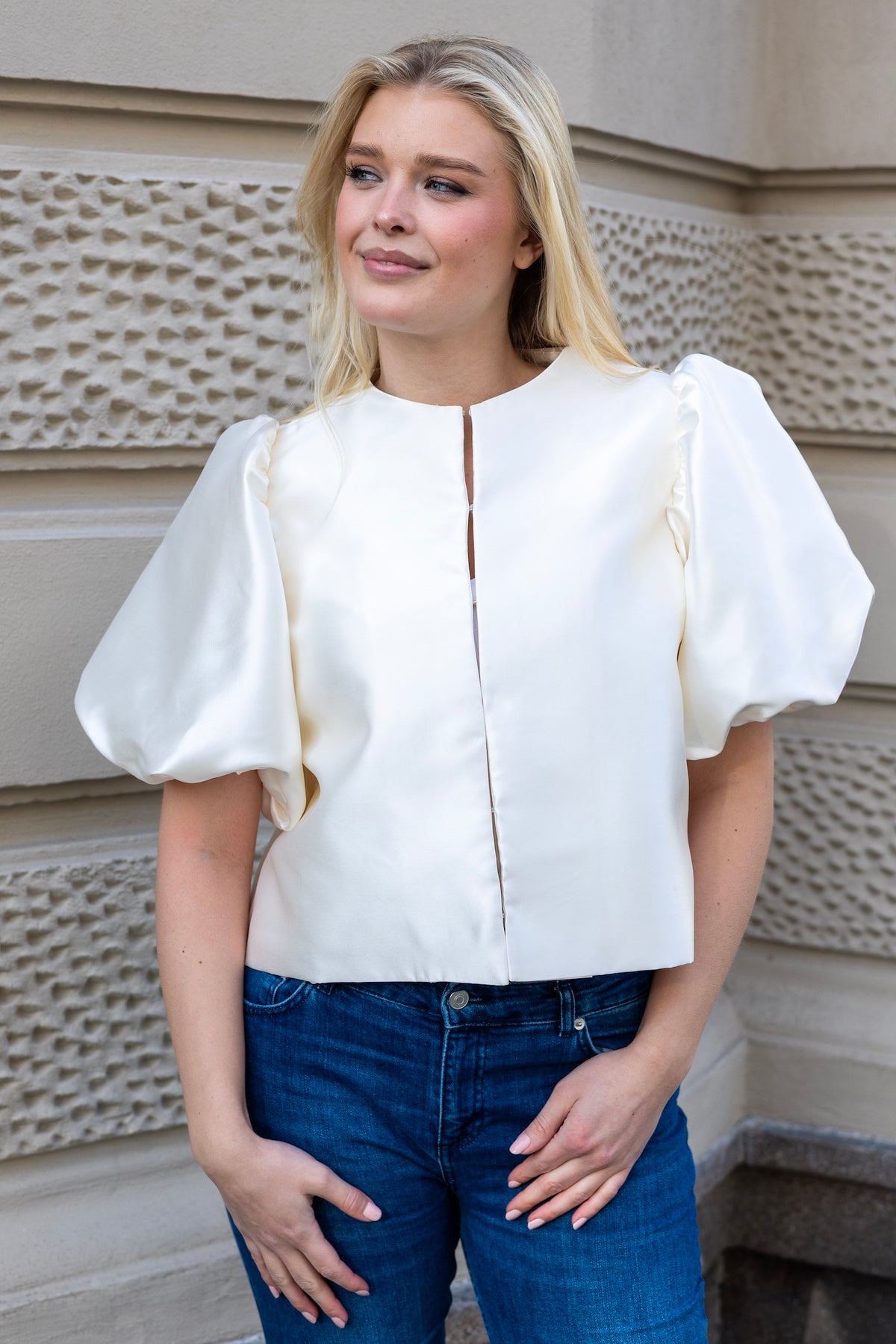 Cleo Blouse Ivory fra Malina er en oversize bluse i elfenbensfarge som skiller seg ut med sine puffy ballongermer. Denne blusen har en vid silhuett i kroppen og skjulte kroker foran. Cleo Blouse Ivory er laget av 100% polyester, mens fôret består av 97% polyester og 3% elastan. Denne blusen er egnet for 30 graders pleievask. Den passer perfekt inn i kategorien skjorter og bluser.