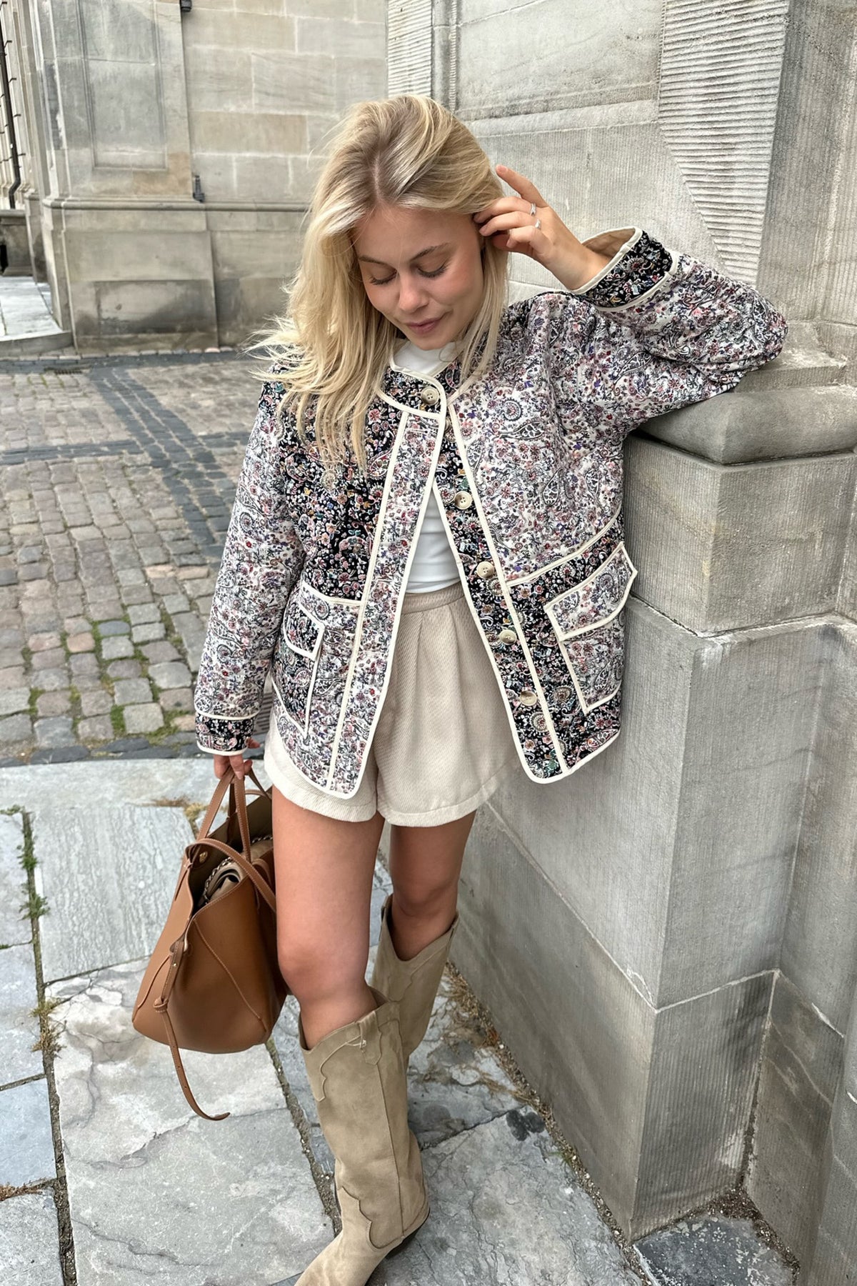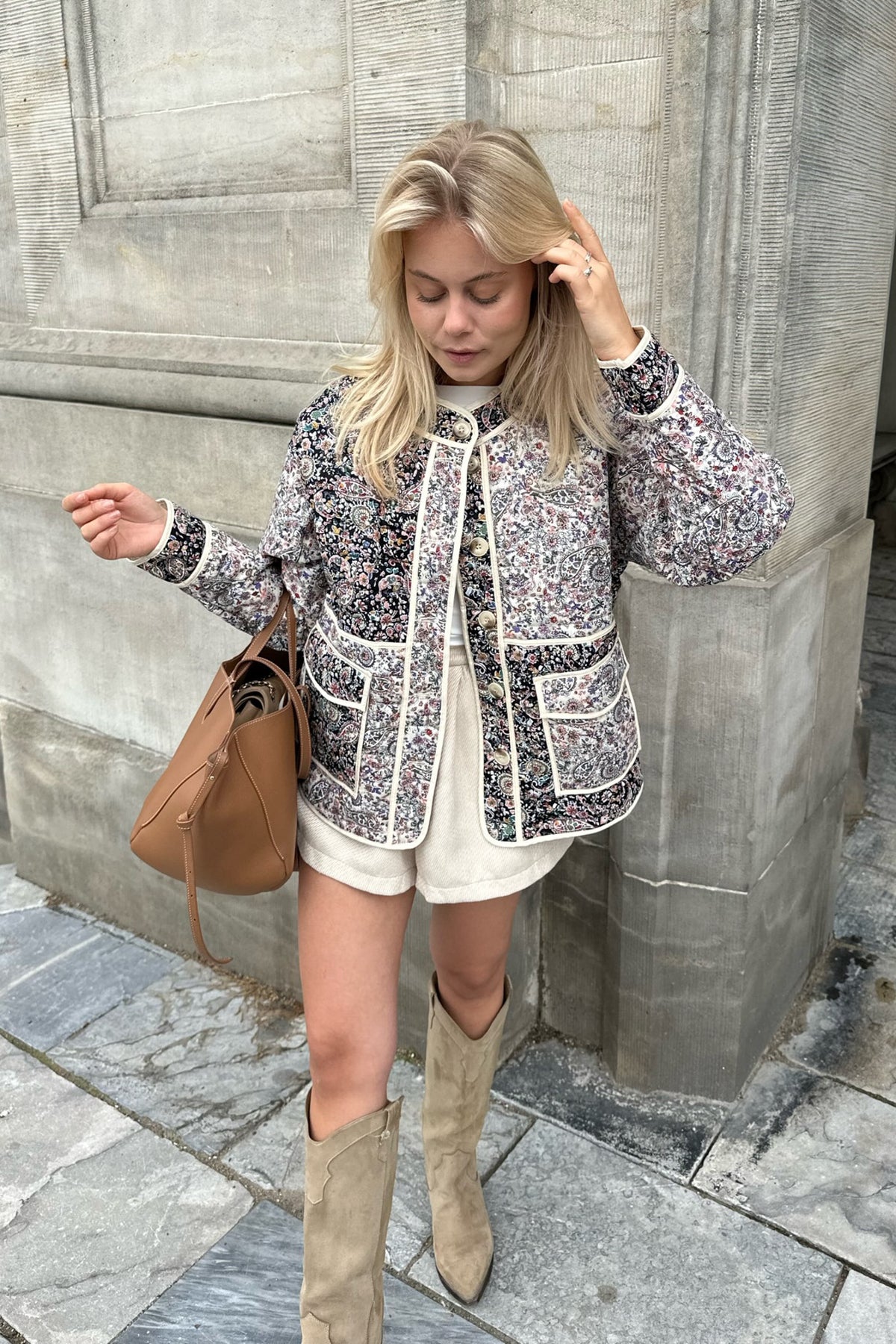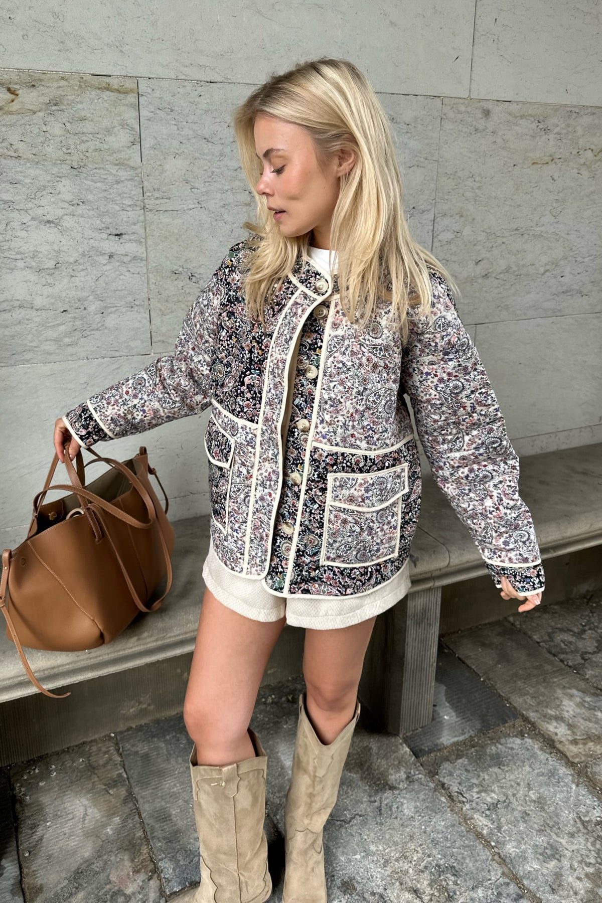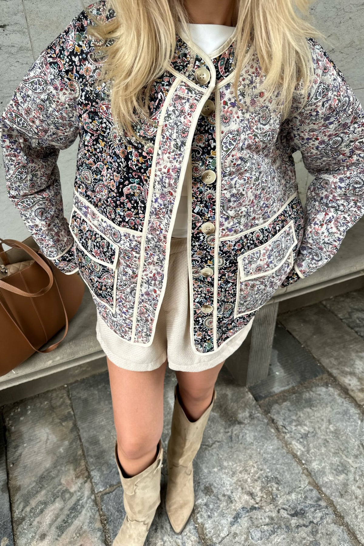 Emmy Quilted Jacket Multi Paisley fra BYIC er en sort og hvit quiltet jakke med et oversized snitt. Denne unike jakken er prydet med et blomstertrykk i forskjellige farger, og har to store lommer samt knapper ned foran. Den er laget av 100% bomull på utsiden, mens fôret er 100% polyester.