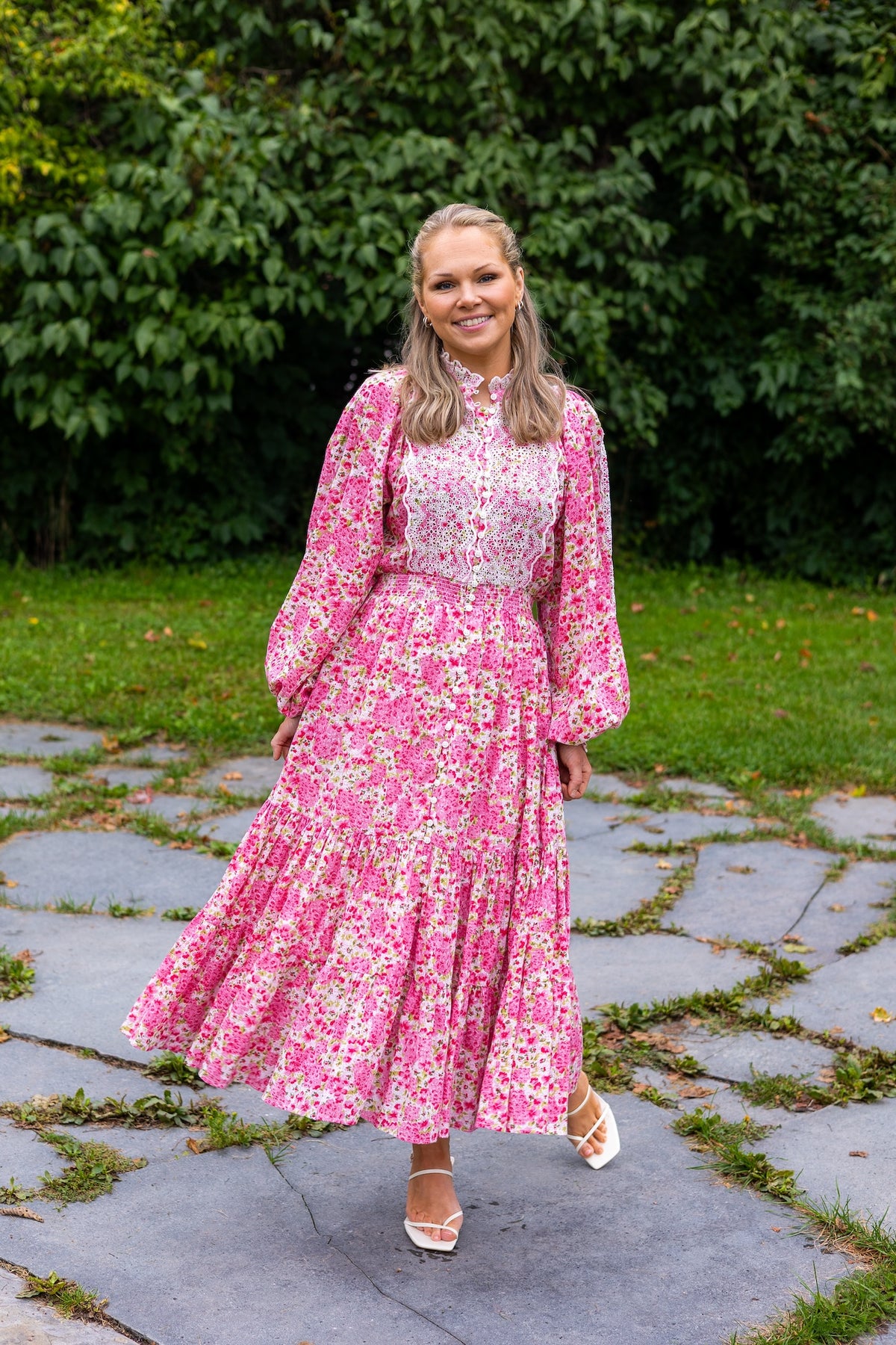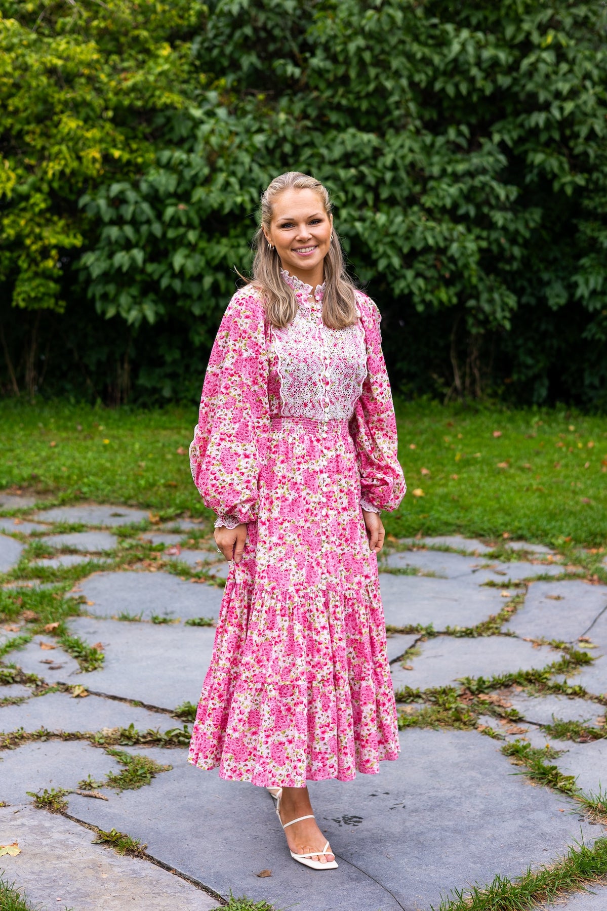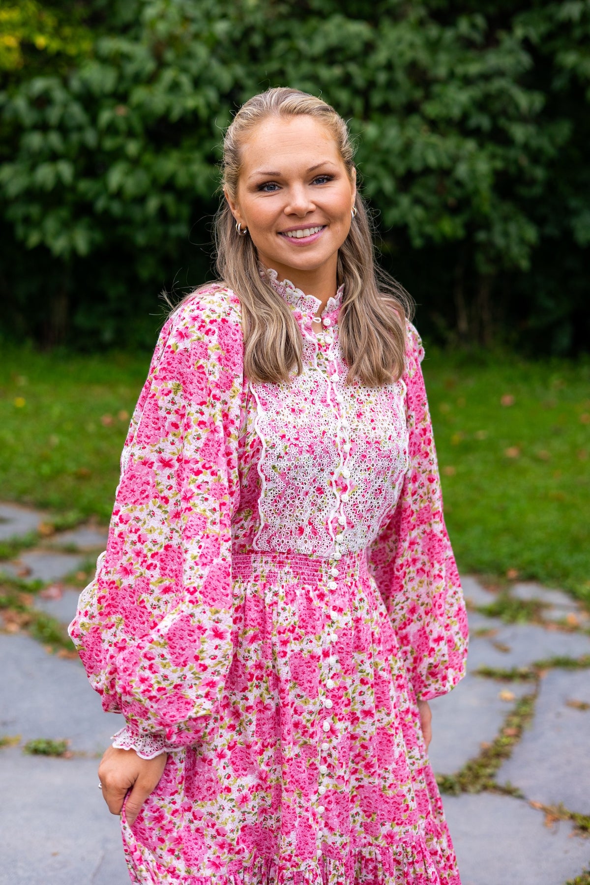 Cotton Slub Midi Dress Summer Fields fra byTiMo er en vakker kjole som kombinerer komfort og stil. Den er laget av 100% GOTS-sertifisert bomull, som gir en lett og myk følelse. Cotton Slub Midi Dress Summer Fields har en midi-lengde, et voluminøst skjørt og tre kvart lange voluminøse ermer med elastiske mansjetter. Den har en mandarinkrage med rynkedetaljer og knapper nedover fronten. Kjolen er utstyrt med en tilpasset midje laget av røyking og et vedlagt bånd med dusk. Ermer, foran og bak på kjolen har vakre broderie anglaise-innlegg.