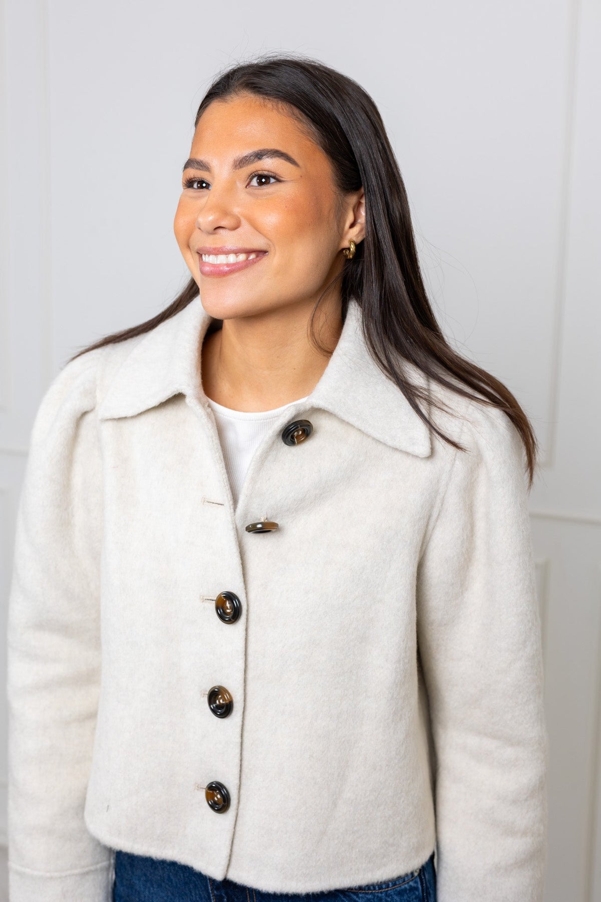 Tailored Cropped Jacket Vintage White fra byTiMo er en luksuriøs yttertøy laget av RWS-sertifisert ull. Denne skreddersydde, beskårne jakken har en litt løs passform, lange ermer med puffede skuldre og knapper ned foran. Tailored Cropped Jacket Vintage White er perfekt å bruke i overgangssesonger eller innendørs på kalde vinterdager. Sammensetningen er 70% ull og 30% polyamid for sjakkrutete, mens faststoff er 70% ull, 10% alpakka, 20% polyamid, alle RWS-sertifisert.