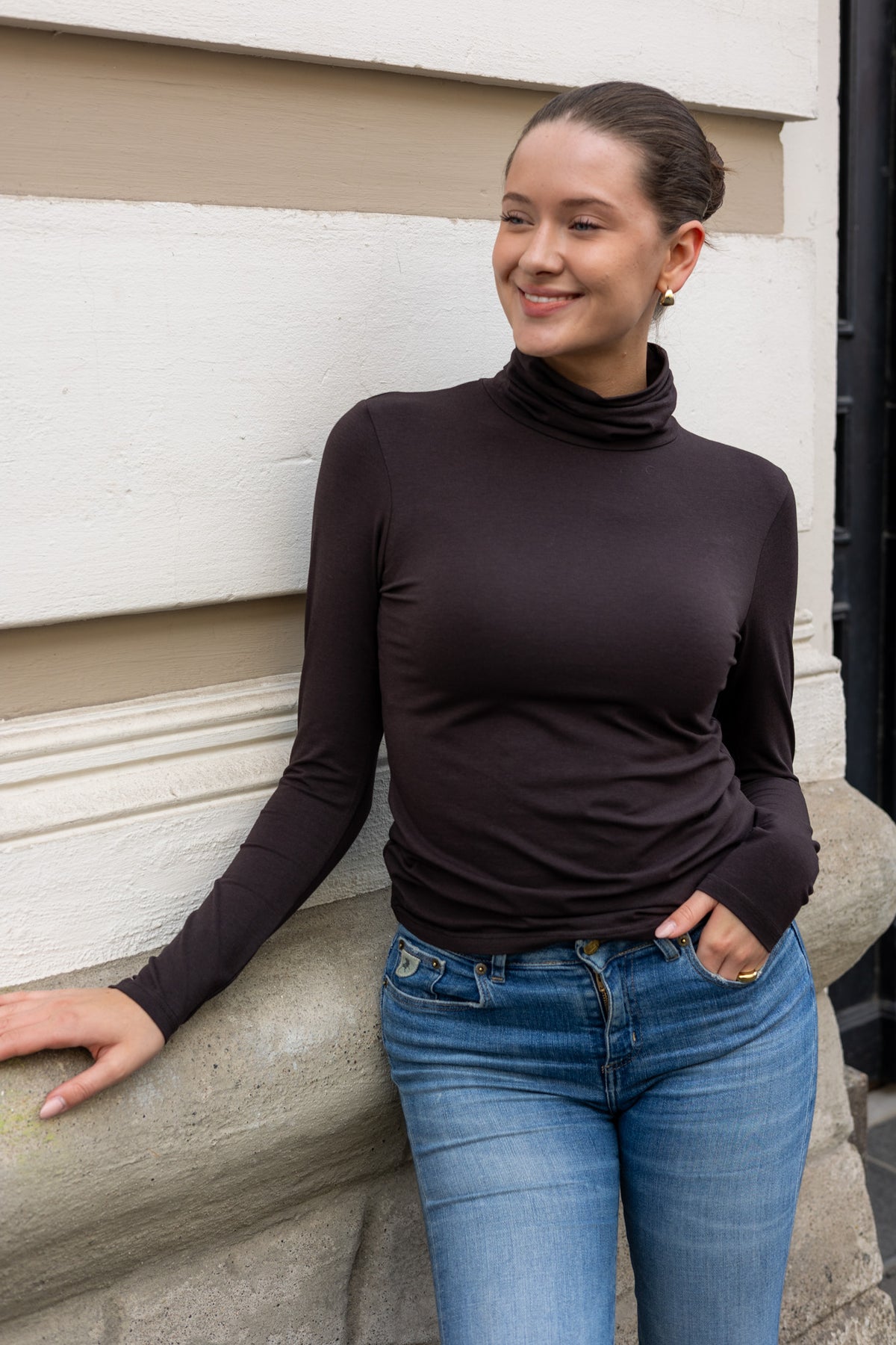 Efinas T-Shirt Ganache fra Part Two er en topp som kombinerer stil og komfort. Denne langærmede t-skjorten er laget av en behagelig blanding av 50% modal (tencelt), 44% organisk bomull og 6% elastan. Efinas T-Shirt Ganache kommer i en mørk Ganache farge, noe som gjør den til et allsidig tillegg til enhver garderobe. Denne toppen er et perfekt valg for både hverdagsbruk og spesielle anledninger.