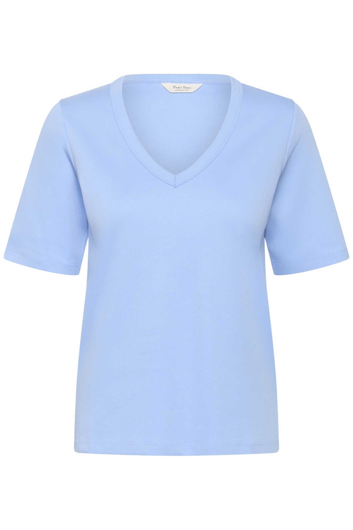 Ratansa T-Shirt Hydrangea fra Part Two er en stilren og allsidig topp i lys blå farge. Den enkle designen gjør den lett å kombinere med andre plagg i garderoben, samtidig som den gir et moderne og komfortabelt uttrykk. Et tidløst hverdagsplagg med sofistikert finish.