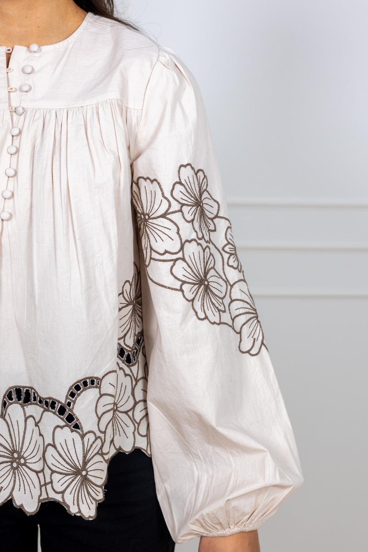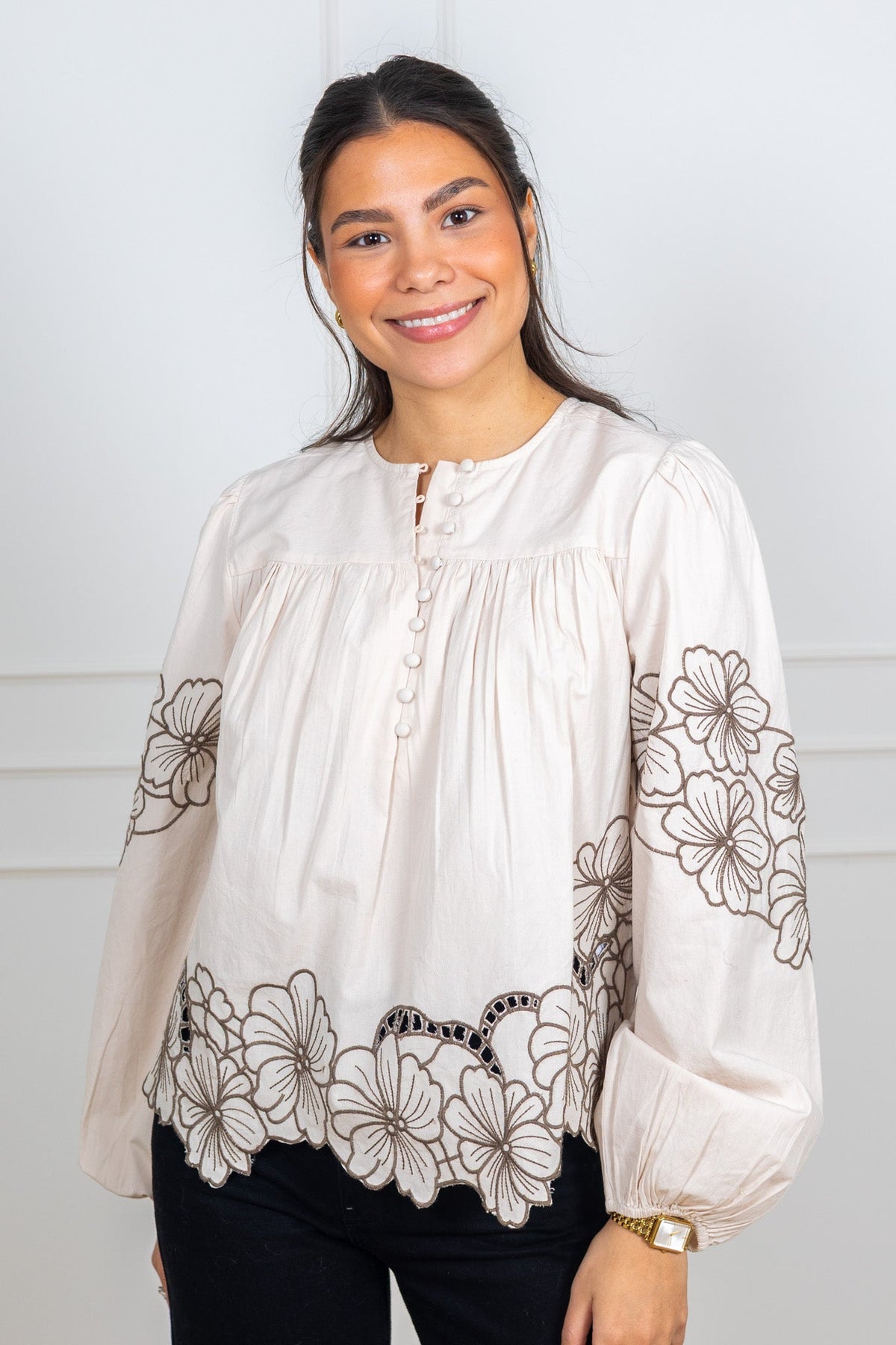 Elinor Blouse Soft Beige fra Second Female er en brodert bluse som er perfekt for både hverdags og fest. Denne skjorten er laget av lett bomull med broderte detaljer, noe som gir den et unikt uttrykk.