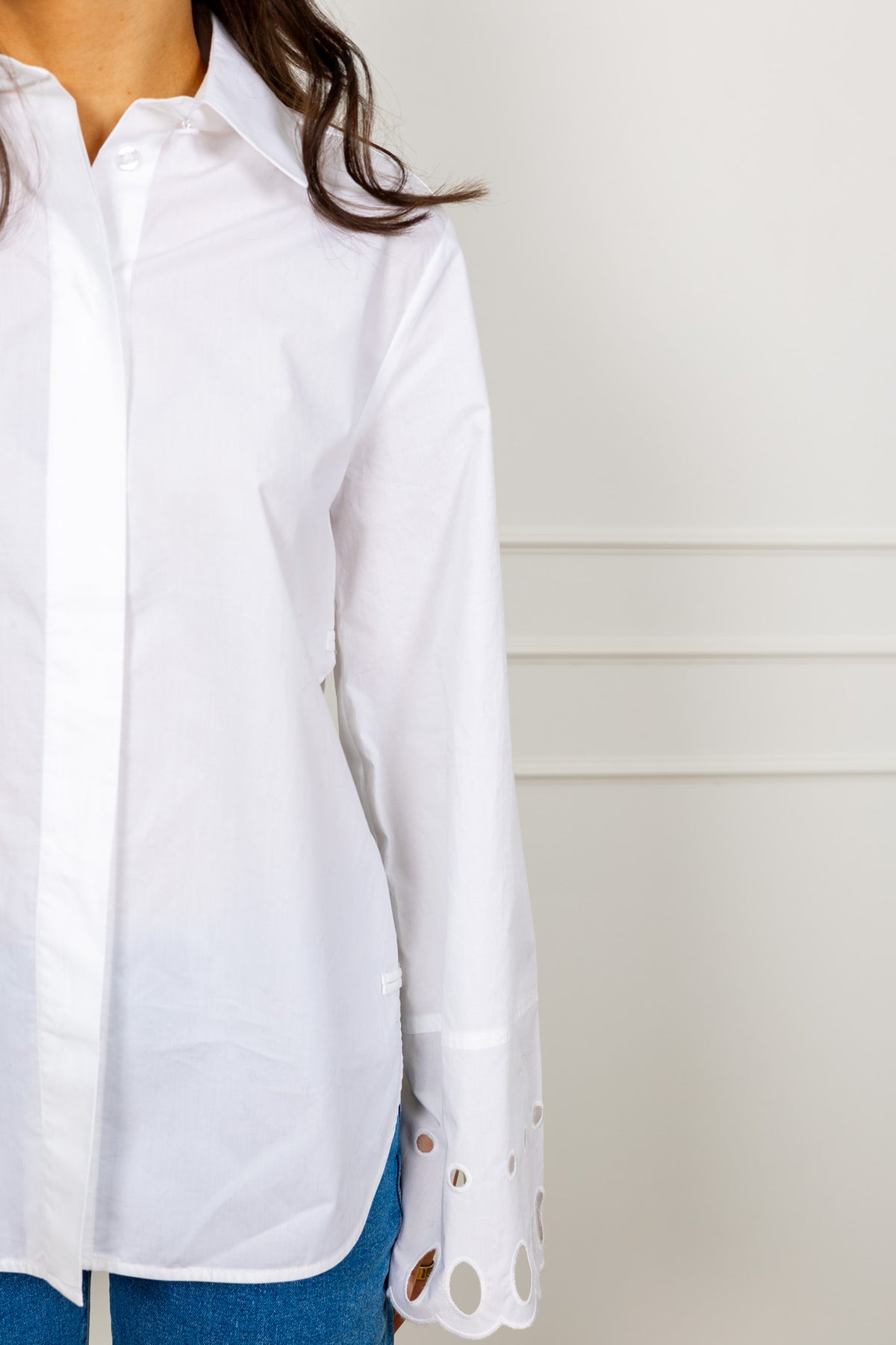 Yenifer Shirt White fra Second Female er en elegant skjorte med delikate detaljer som gir et sofistikert uttrykk. Den er laget av glatt bomull med dekorative hull ved mansjettene og har knappelukking foran. Åpne sider med knapp- og løkkefesting gir et moderne preg, mens den løse passformen sikrer komfort og bevegelsesfrihet. Perfekt til både hverdags og festlige anledninger.