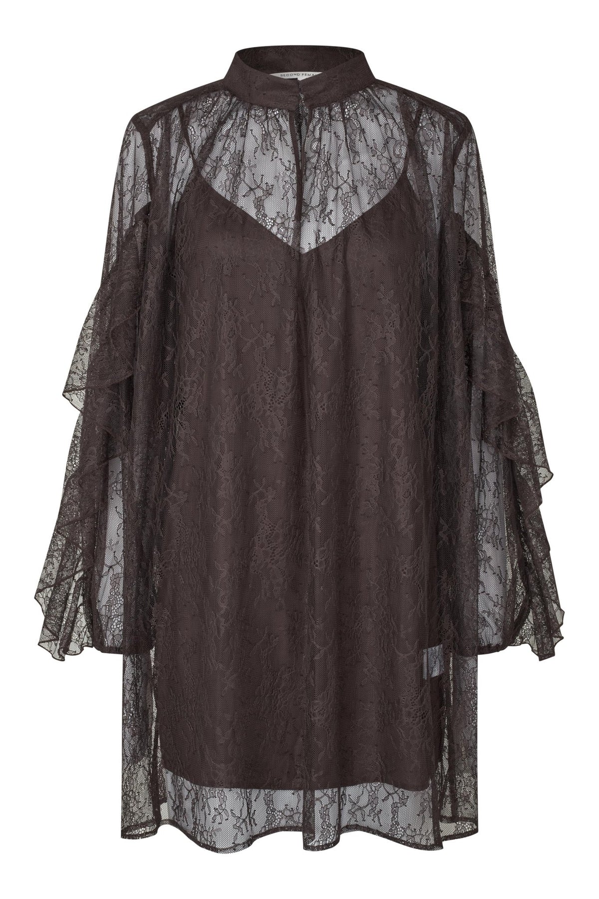 Sybell Lace Dress Chocolate Torte fra Second Female er en lagdelt blondekjole i fargen chocolate torte. Denne kjolen er laget av ren blonde med en avtakbar tonal underslip. Den har en knappelukking i front, brede ermer med vridde volangdetaljer og elastiske mansjetter. Underslipen er vanlig, mens selve kjolen er løs. Sybell Lace Dress Chocolate Torte er laget av 100% polyester, noe som gjør den lett og behagelig å ha på.