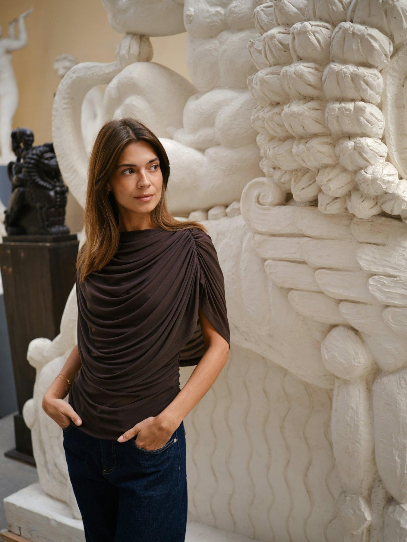Oppdag Cottuna Drapy Mesh Top Brown fra Neo Noir. Denne elegante toppen er designet med en unik draperende vandfalds effekt foran, og rynk langs sidesømmen som gir et sofistikert uttrykk. Cottuna Drapy Mesh Top Brown er laget av 100% nylon, med en fôring av 100% polyester, noe som sikrer komfort og holdbarhet. Modellen er 176 cm høy og bruker størrelse 36. Perfekt for kategorien topper, denne toppen er et must for enhver stilbevisst garderobe.