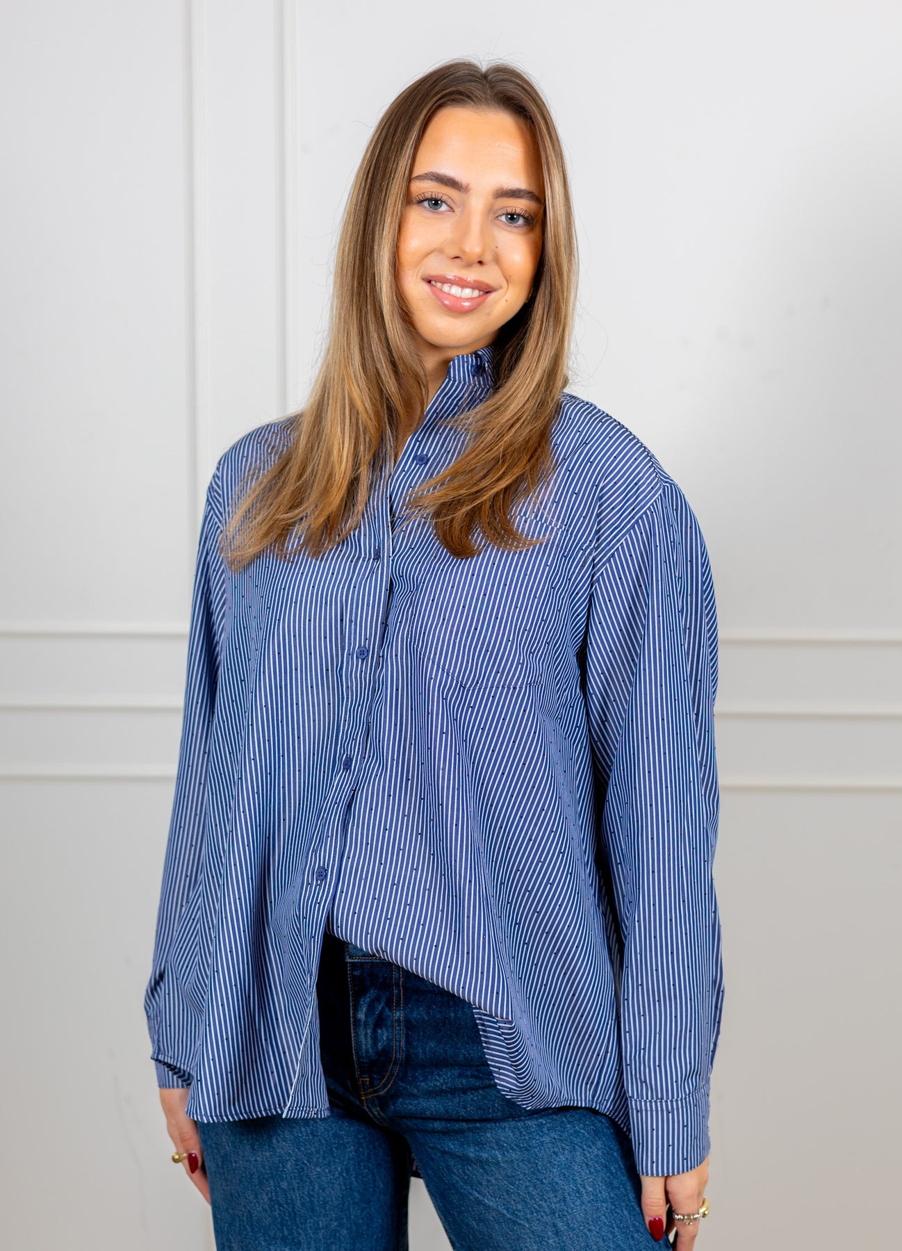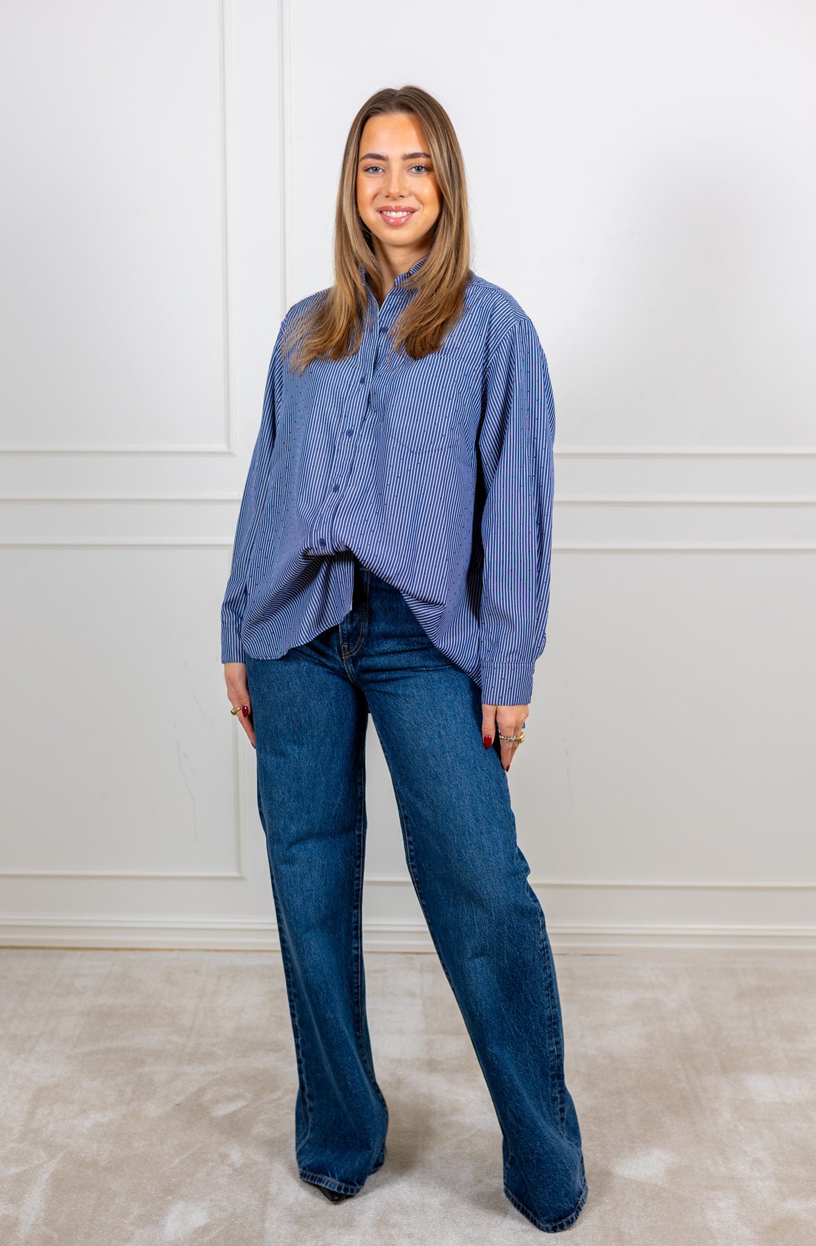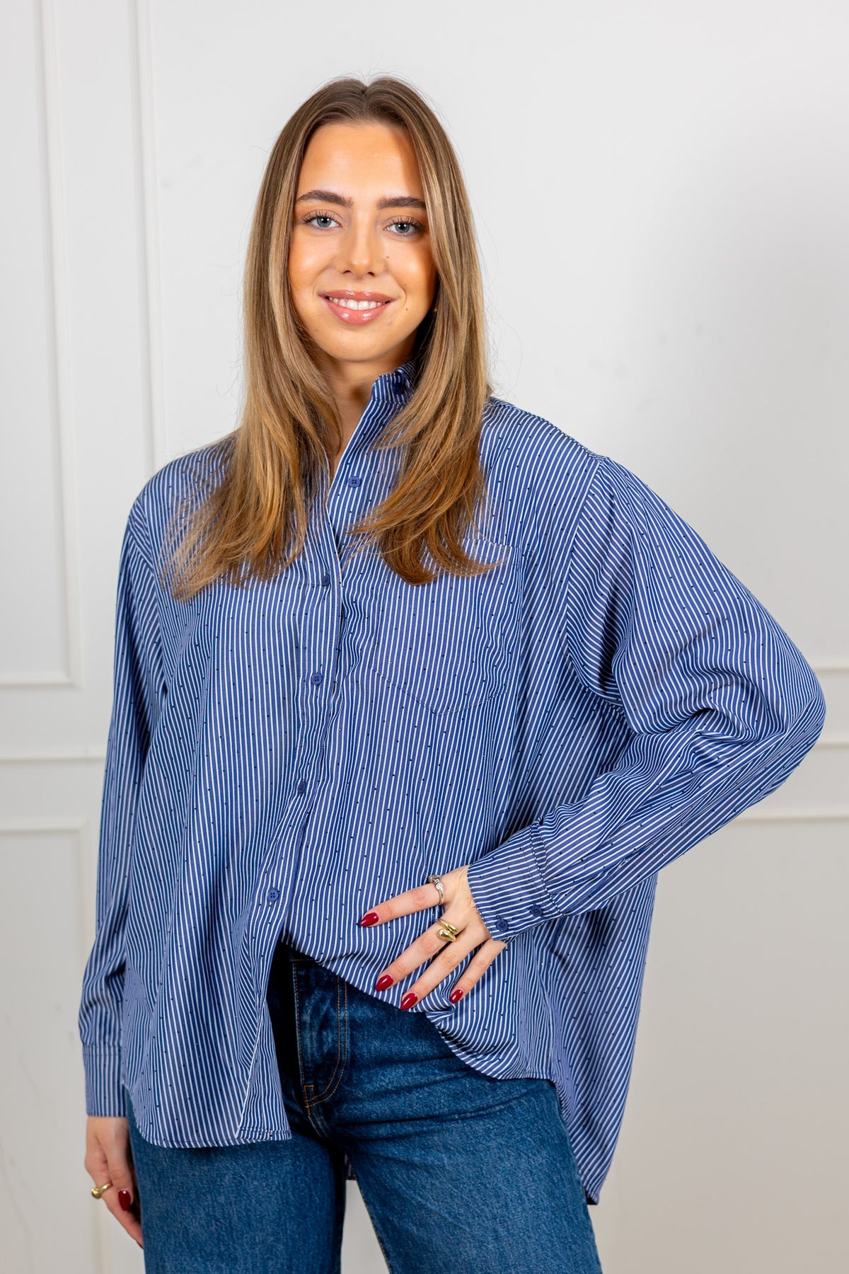 Dalma B Stripe Stone Shirt Midnight Blue fra Neo Noir er et flott tillegg til din garderobe. Denne kule oversize skjorten er laget i en fin stripet poplin kvalitet med glittersten, som gir et unikt og stilig uttrykk. Skjorten er i midnattsblå farge, noe som gjør den perfekt for både dag og kveld. Laget av 65% bomull og 35% polyester, er Dalma B Stripe Stone Shirt Midnight Blue både behagelig og slitesterk. Passer for deg som er 176cm og bruker størrelse 36. Perfekt for kategorien skjorter og bluser.