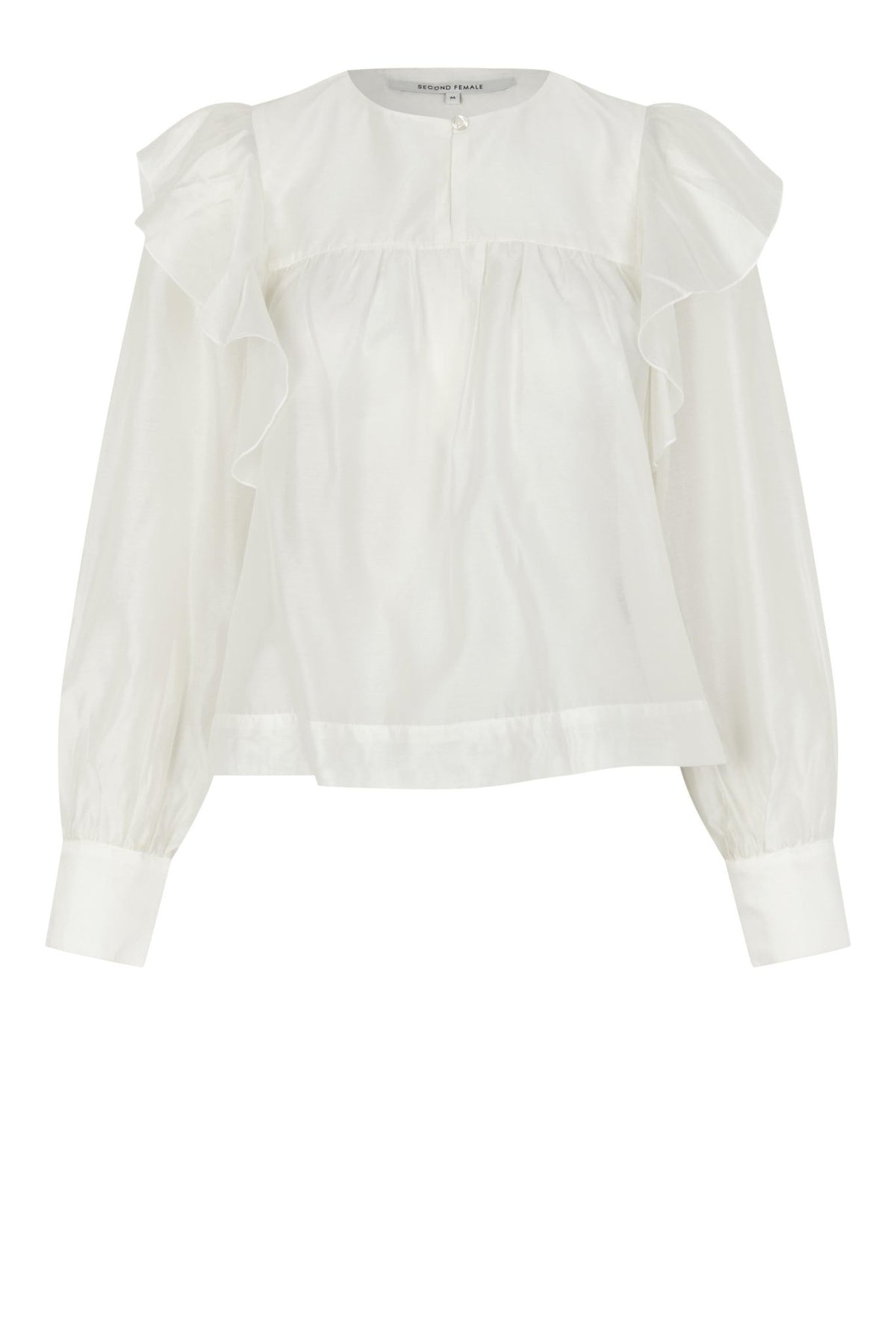 Dream Ruffle Blouse Jet Stream fra Second Female er en elegant rynkebluse i lett, gjennomsiktig stoff. Denne blusen har en nøkkelhullåpning med knappelukking, rynker ved skuldrene og lange ermer med knappede mansjetter. Den brede midjen med rynkedetaljer gir en avslappet, luftig passform. Dream Ruffle Blouse Jet Stream er perfekt for dem som søker en kombinasjon av stil og komfort. Sammensetning: 85% lyocell, 15% polyester.