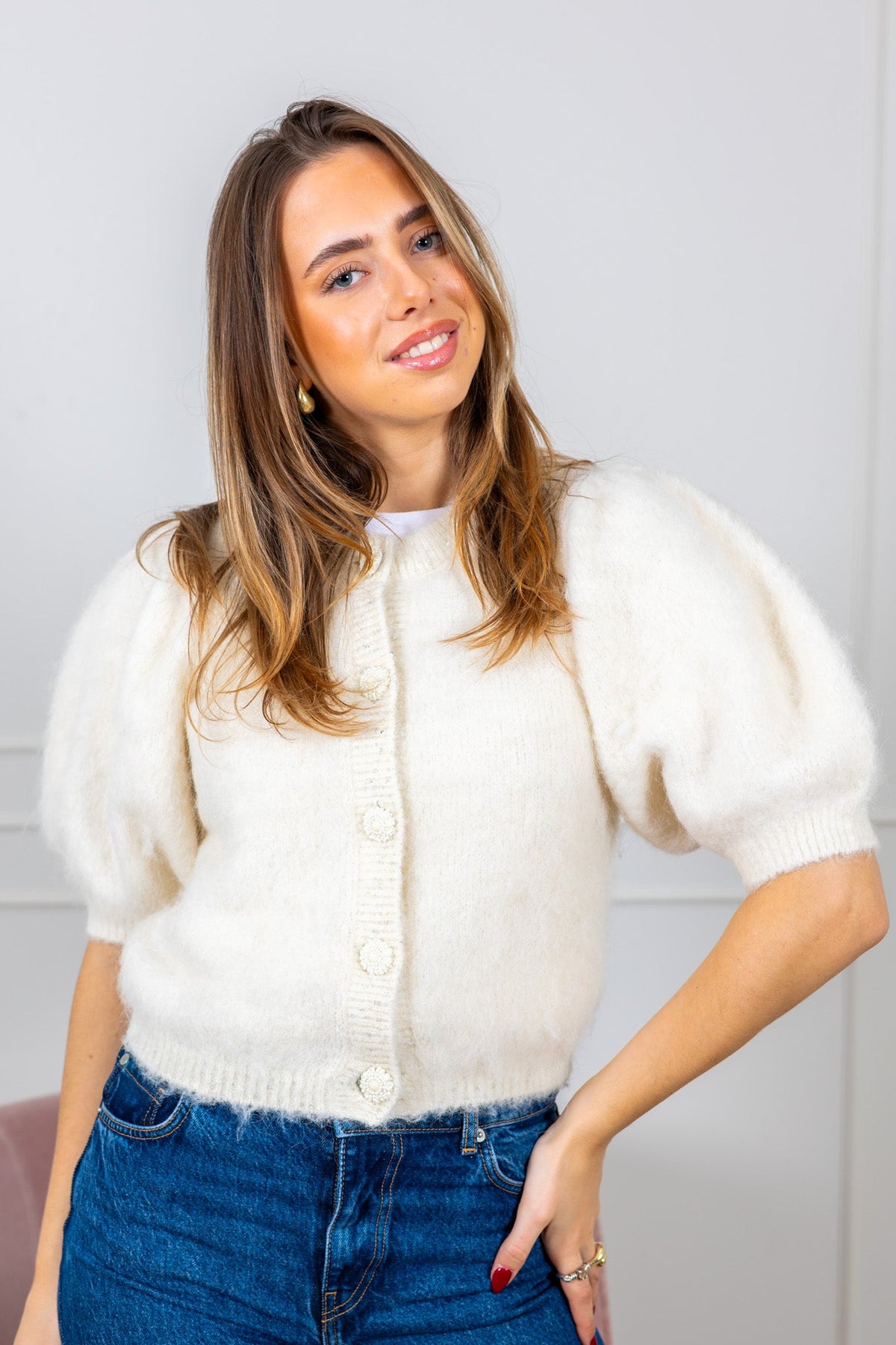 Hairy Knit Puffed Jacket Off White fra byTiMo er en unik genser i en off white farge. Denne jakken er laget av en svært myk og fluffy blanding av RAS-sertifisert garn. Hairy Knit Puffed Jacket Off White har en kort, tilpasset silhuett, korte puffed ermer med elastiske mansjetter og en rund hals. Mansjettene, halslinjen og hemlinjen har vakre ribbedetaljer. Jakken lukkes foran med dekorative knapper. Sammensetning: 52% apaca, 20% nylon, 16% akryl, 2% spandex - RAS-sertifisert.