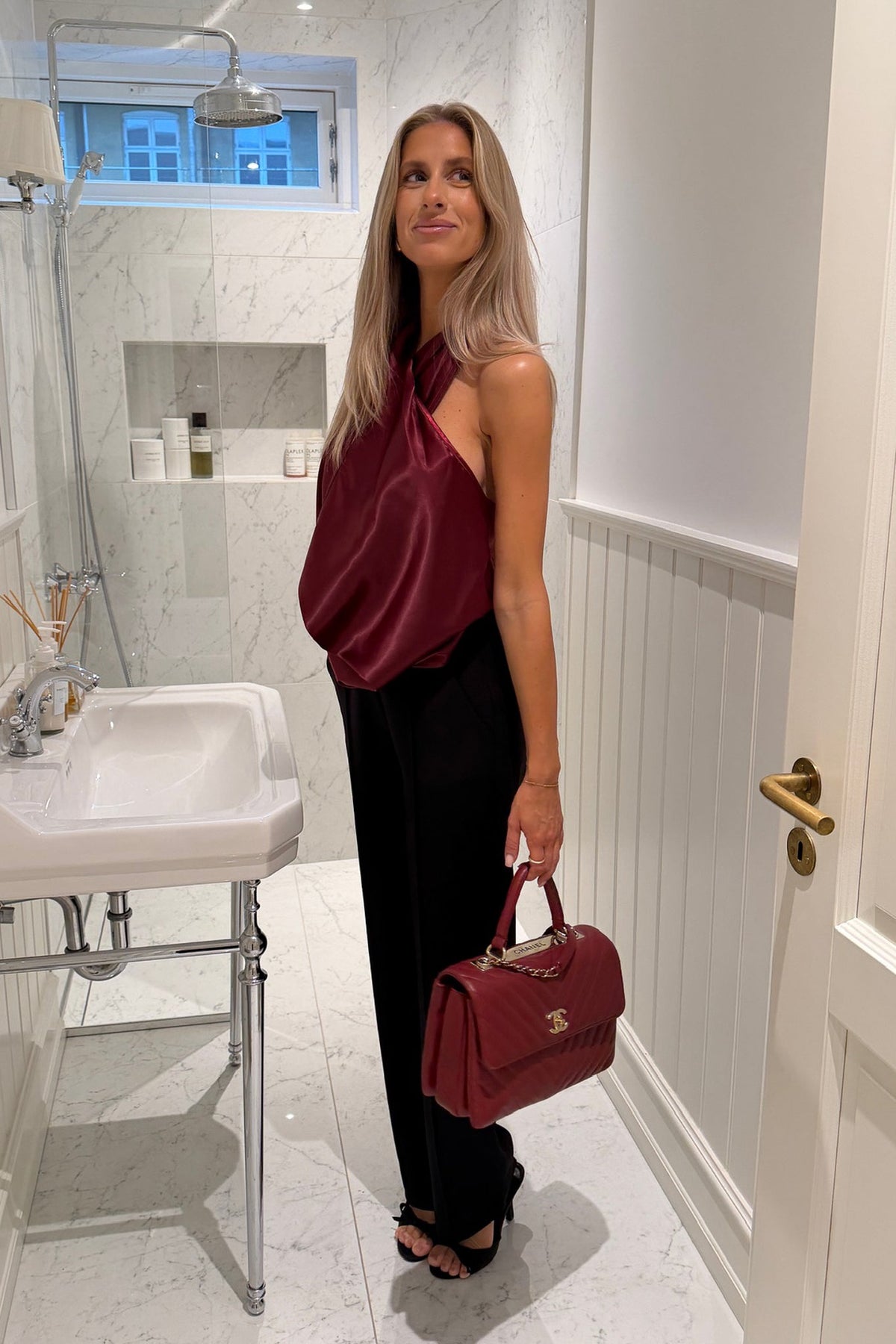 Holly Wrap Top Bordeaux fra BYIC er en elegant halterneck-topp laget av glansfull satin med et vakkert drapert front. Den brede knytingen ved halsen skaper et sofistikert utseende, og en åpen rygg gir en feminin og raffinert touch. Den myke satengstoffet har en lett strekk for en flatterende passform og en luksuriøs følelse mot huden. Perfekt for både spesielle anledninger og opphøyede hverdagsutseende - style den med skreddersydde bukser eller en skjørt for et moderne, tidløst antrekk. Holly Wrap Top Bordeaux er tro mot størrelsen. Sammensetning: 95% polyester, 5% elastan.