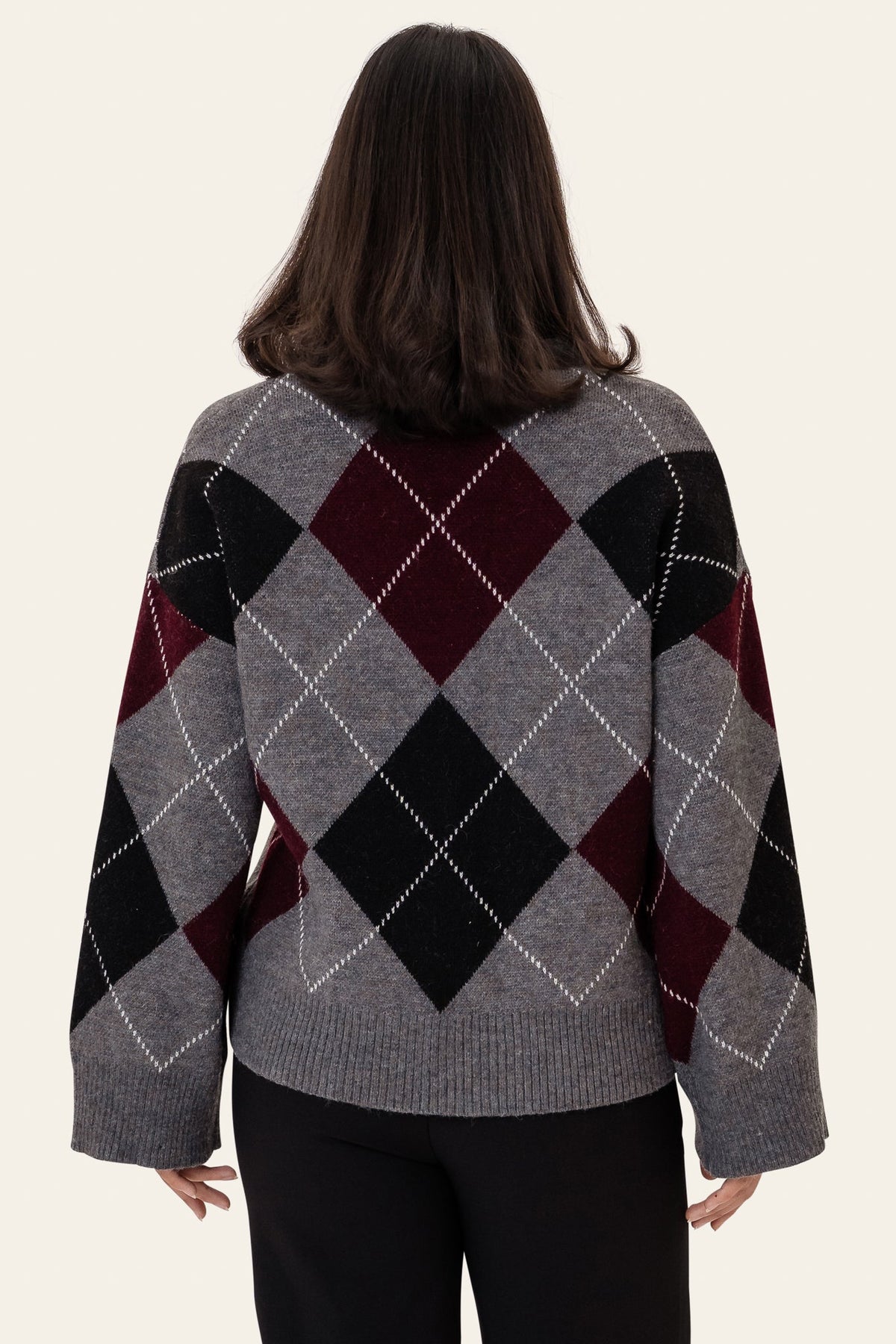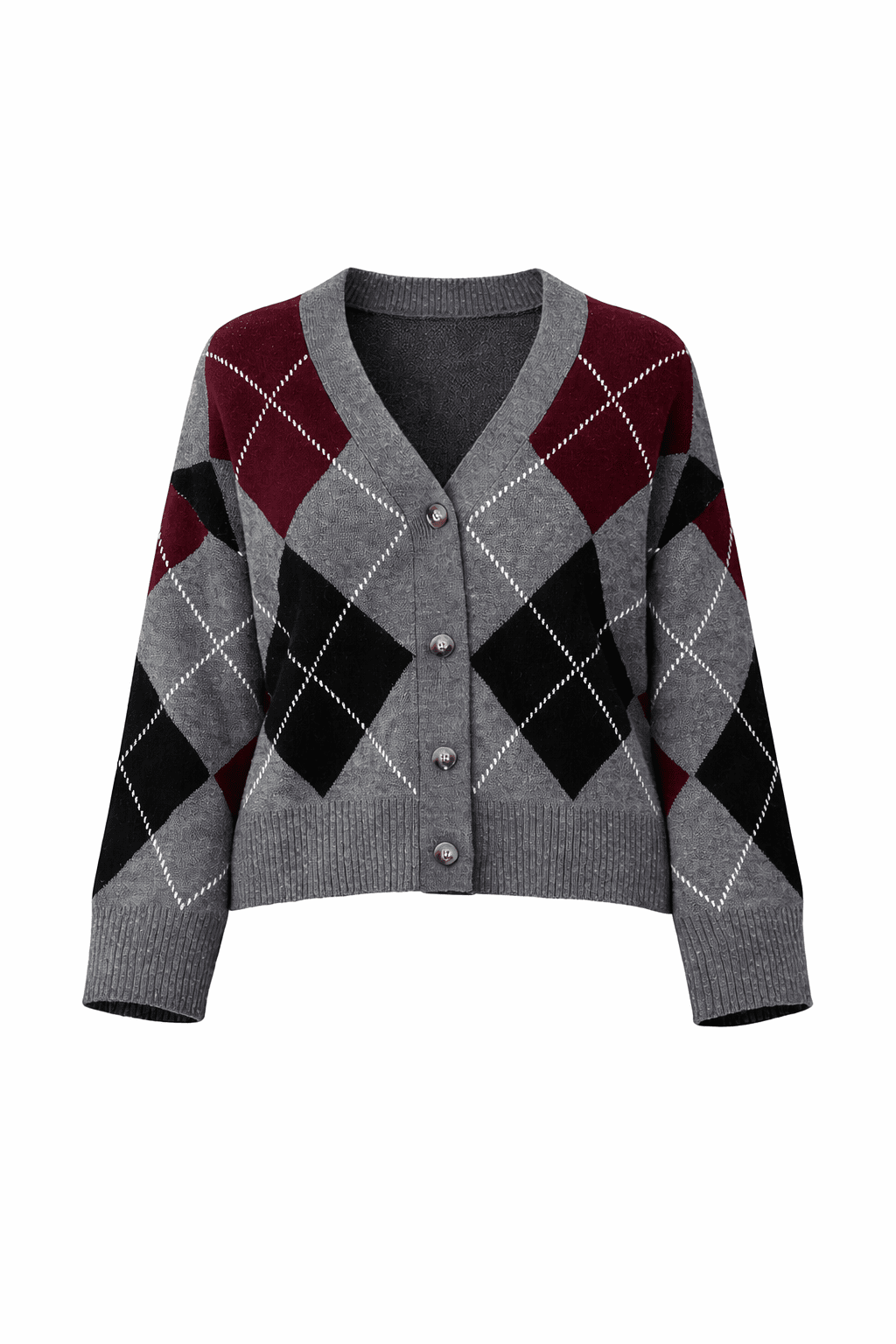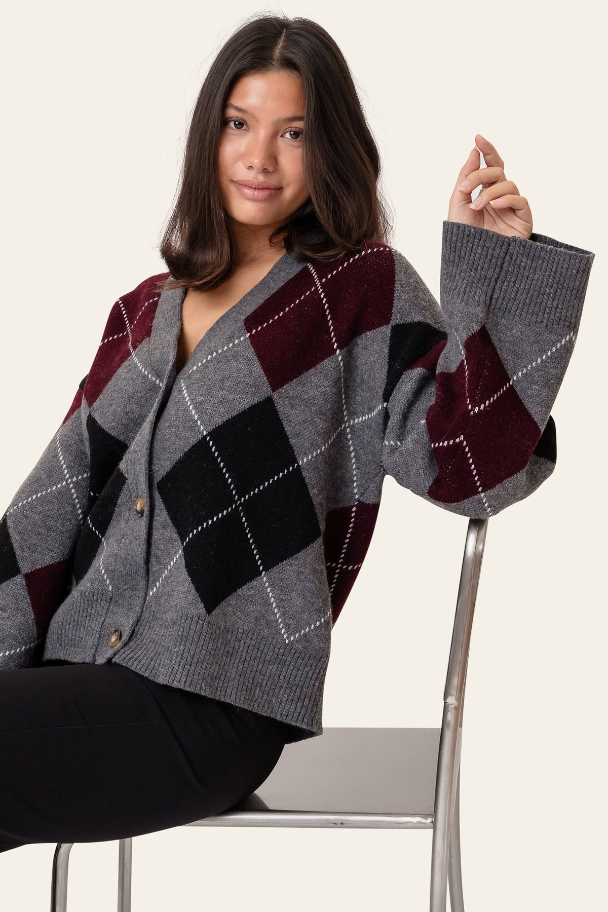 Sascha Cardigan Grey Argyle fra BYIC er en klassisk cardigan med en moderne vri, som viser et argyle-mønster i nyanser av grått, svart og burgunder. Designet med en litt oversized passform, fallende skuldre, en V-hals og foran knappelukking, gir denne cardiganen en unik stil og komfort. Denne cardiganen er perfekt for både hverdagsbruk og koselige anledninger. Ribbekantene og kanten gir en subtil struktur, mens det myke, varme strikket gjør det behagelig å ha på. Stil det over en skarp skjorte for en preppy touch, eller med en enkel t-skjorte for et mer avslappet utseende.