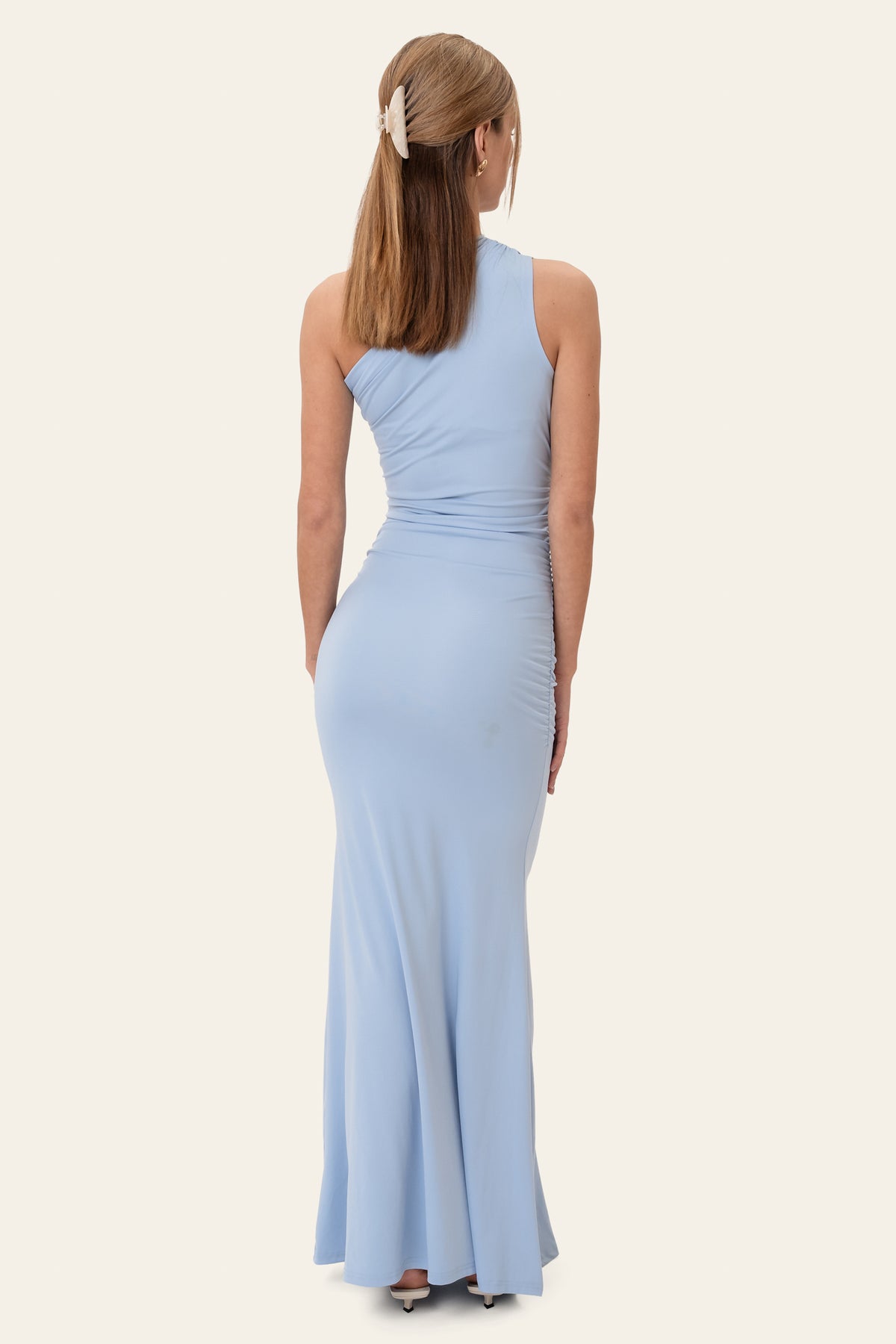 Andrea Maxi Dress Blue er en vakker en-skulder maxikjole i blått. Denne kjolen er laget av et herlig stretchy stoff som gir den et elegant, kroppsnært utseende, mens A-linjeformen nederst gir den et mer flytende utseende. Den har rysjedetaljer langs siden og over skulderen for en feminin touch. Andrea Maxi Dress Blue har en lengde på ca. 154 cm i størrelse S. Det anbefales å bruke nøytralt undertøy eller formende undertøy under. Hvis du er mellom størrelser, anbefales det å gå en størrelse ned. Vaskeanvisning og sammensetning følger med produktet.