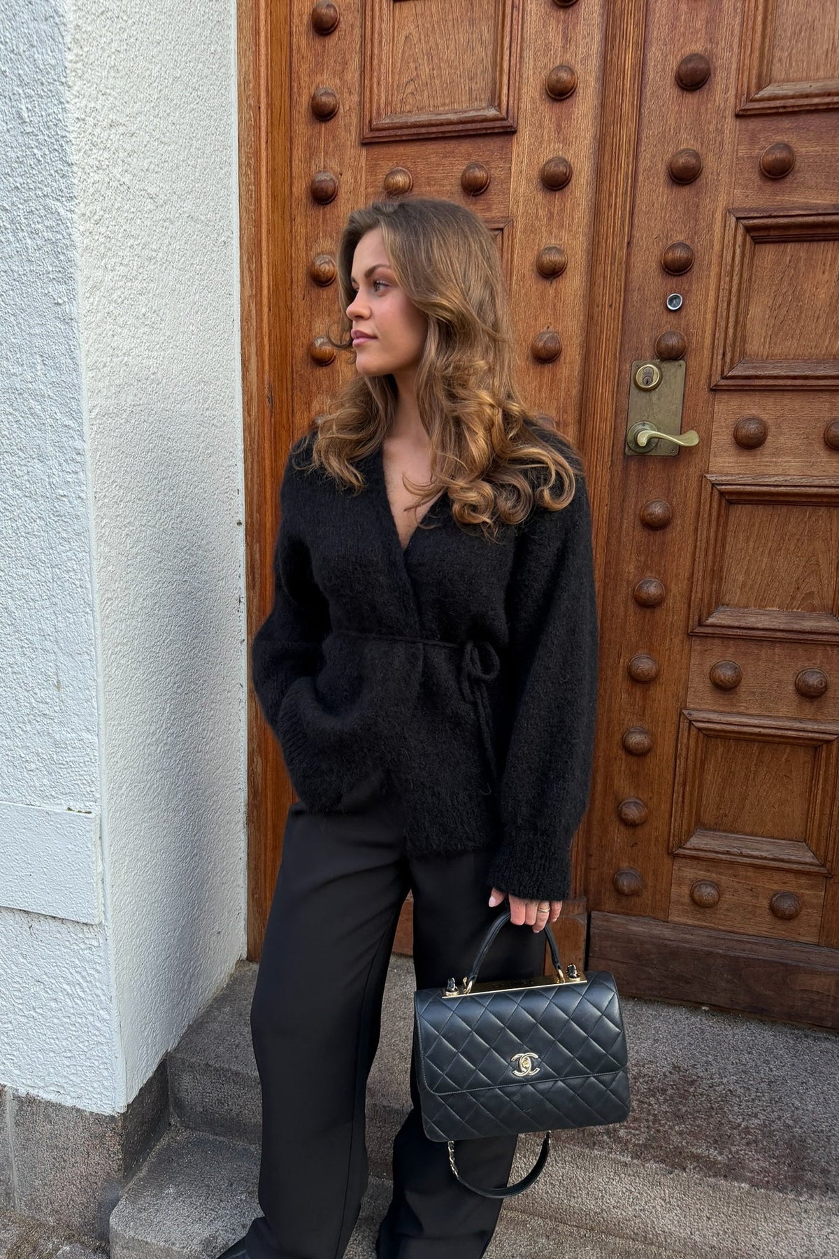 Ida Wrap Cardigan Black er en luksuriøs og myk cardigan fra BYIC, utført i en delikat mohairblanding. Denne modellen henter inspirasjon fra den populære Ida-serien og kommer her i et elegant omslagsdesign som knytes i midjen. Det medfølgende beltet markerer midjen og skaper en feminin silhuett, mens de lange ermene med en diskret ballongfasong gir plagget et sofistikert uttrykk.