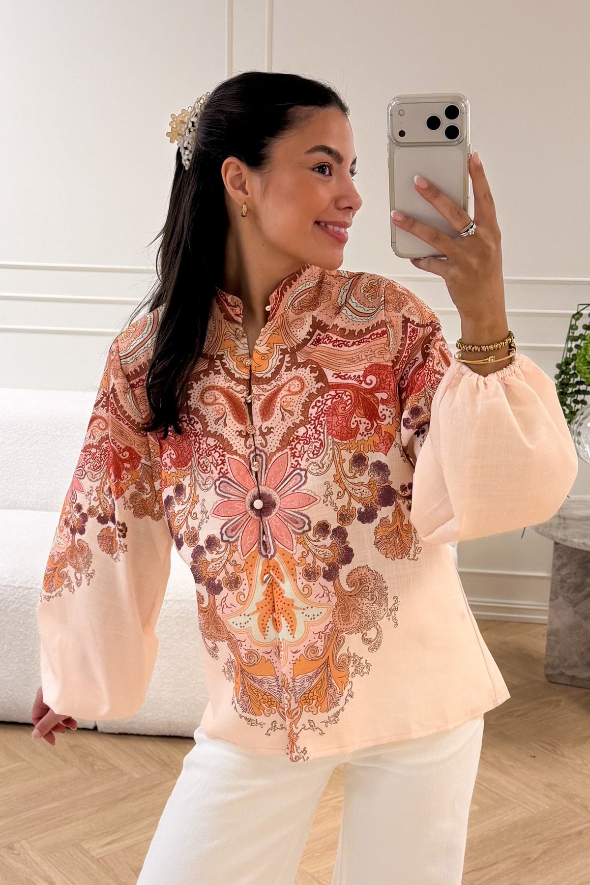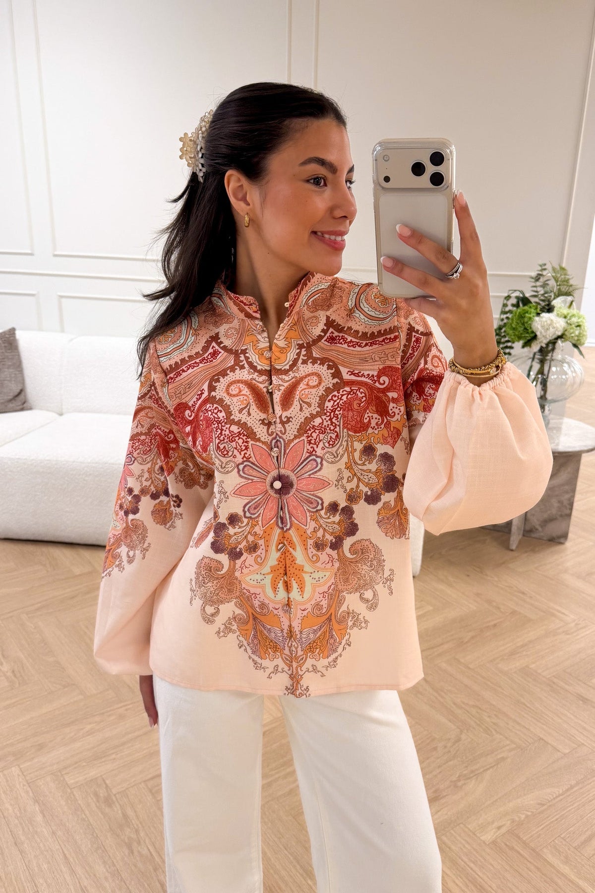 Frime Blouse Beige Paisley fra From Paris With Love er en romantisk og chic bluse som kombinerer et tidløst uttrykk med et lekent paisleymønster. Den delikate fargepaletten i beige toner gir plagget et mykt og harmonisk preg, samtidig som de gjennomførte detaljene tilfører et moderne og raffinert uttrykk.