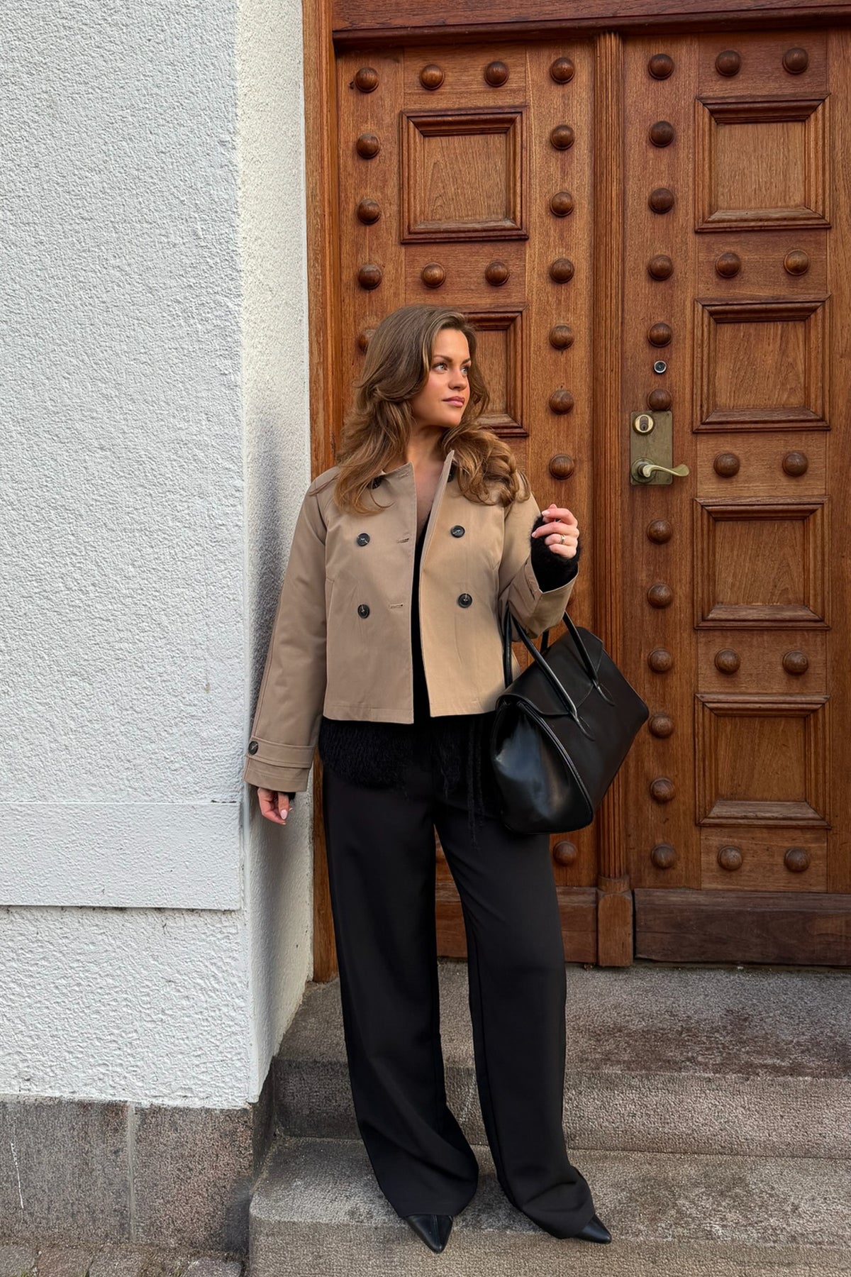 Luna Trenchcoat Light Brown fra BYIC er en elegant, kort trenchcoat i fargen Light Brown som kombinerer et klassisk uttrykk med en moderne, løs passform. Denne Luna Trenchcoat Light Brown har stilrene naturfargede knapper i front og dekorative stropper på ermene som festes med knapp. Jakken er utstyrt med to praktiske lommer foran, men kommer uten knytebelte for et renere uttrykk. Med en lengde på ca. 56 cm i størrelse small er den normal i størrelsen. Sammensetning: 100% polyester. Vedlikehold: maskinvask på 30 grader, bør ikke tørketromles.