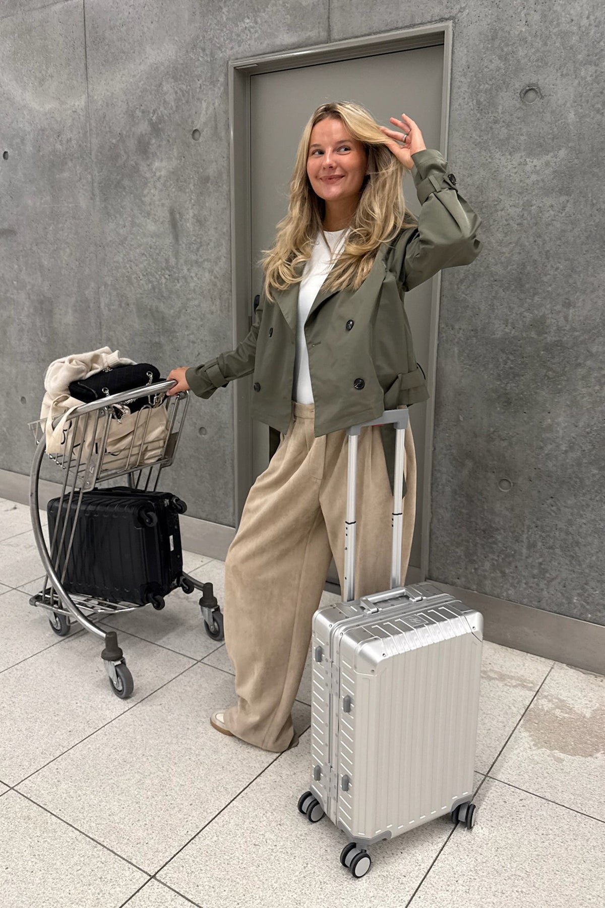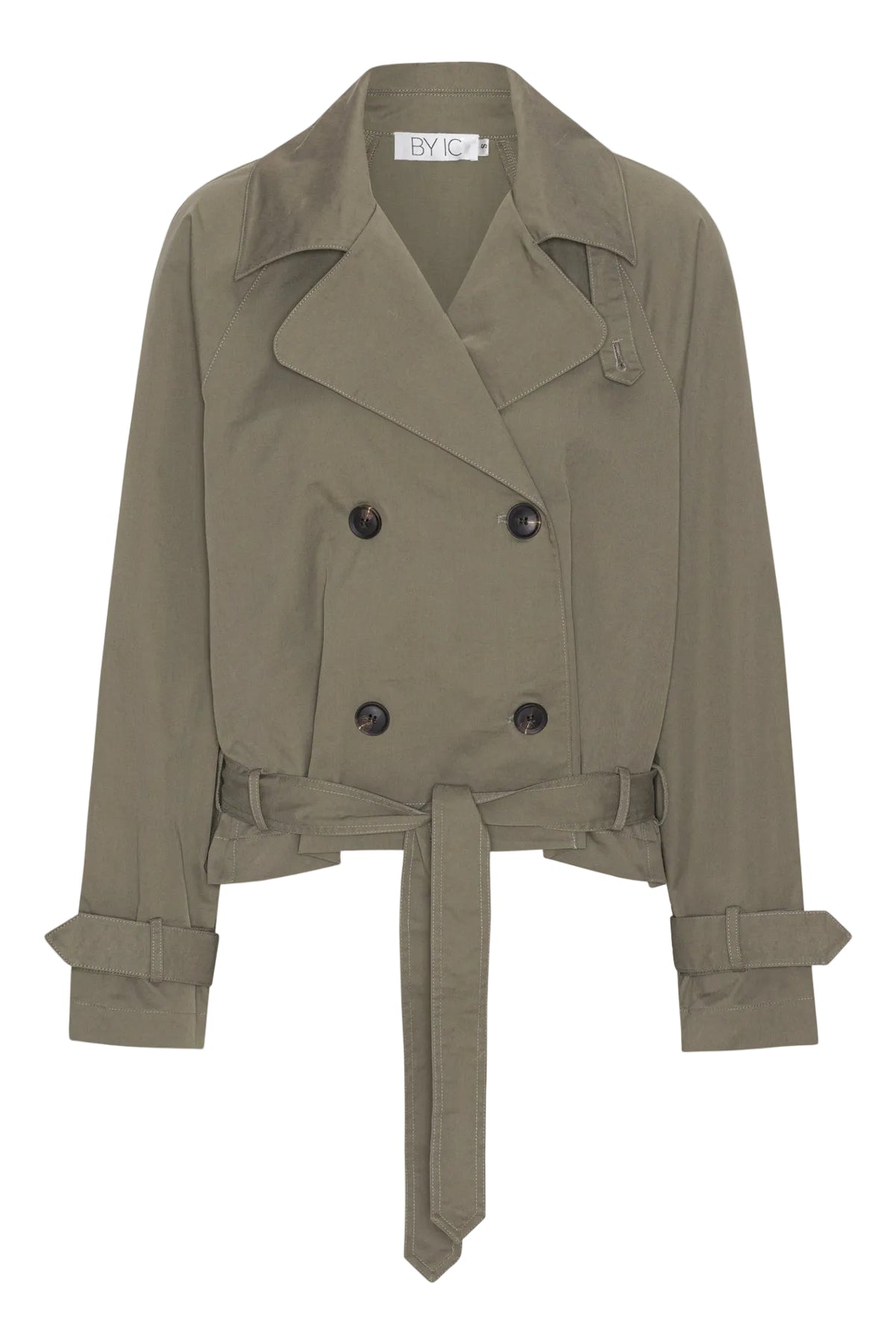 Alma Trenchcoat Green er en kort trenchcoat fra BYIC med knapper og et bånd rundt midjen. Denne ytterjakken har en oversized passform, men er tro mot størrelsen. Den er laget av en behagelig blanding av 65% bomull og 35% polyester, noe som gjør den både stilig og praktisk for varierte værforhold.